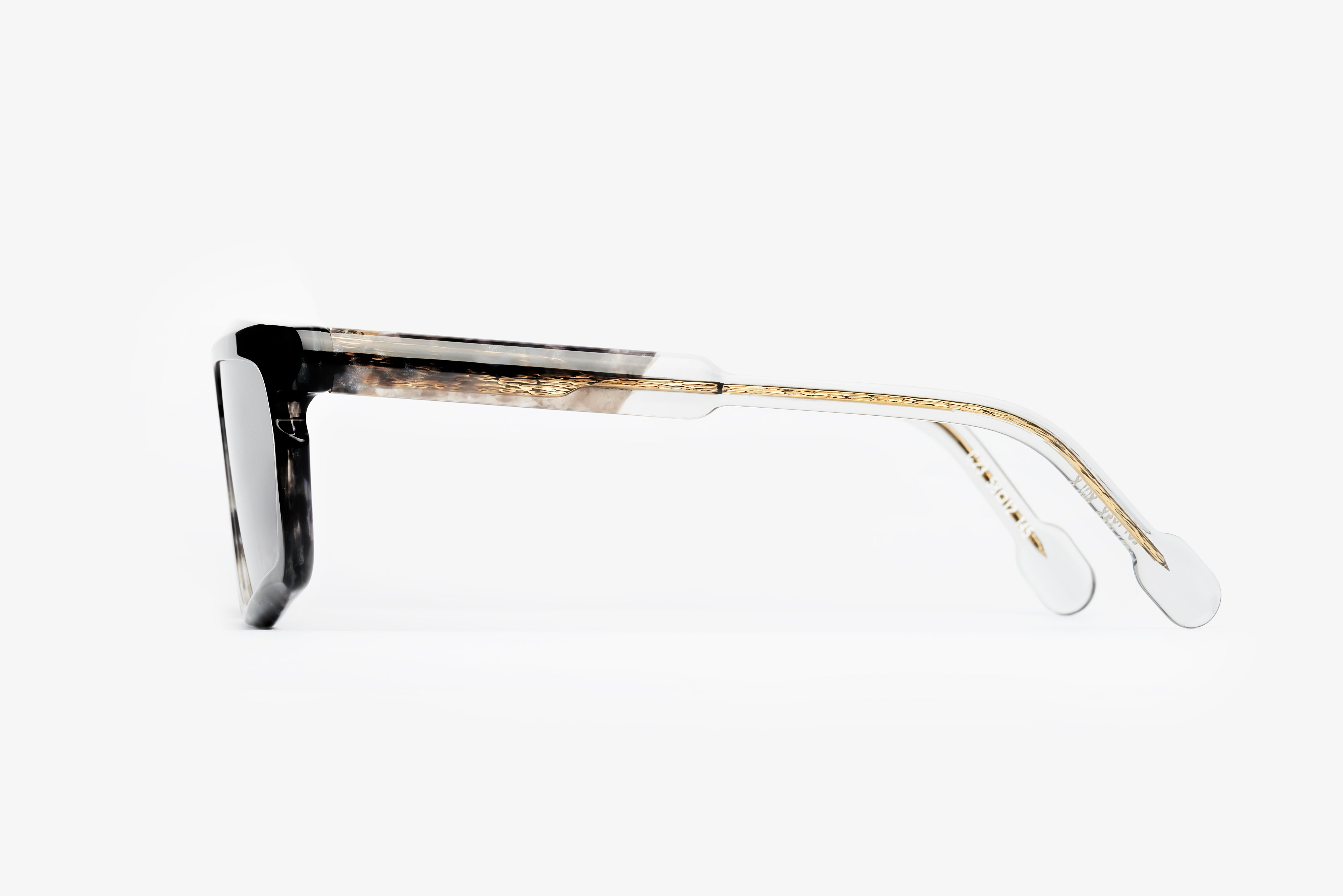 The balance between sharp and round edges and the colored acetate bonding by lamination in the temples are PORTRAIT staples. The hammered visible metal components and grey gradient lenses enrich the look of this piece.