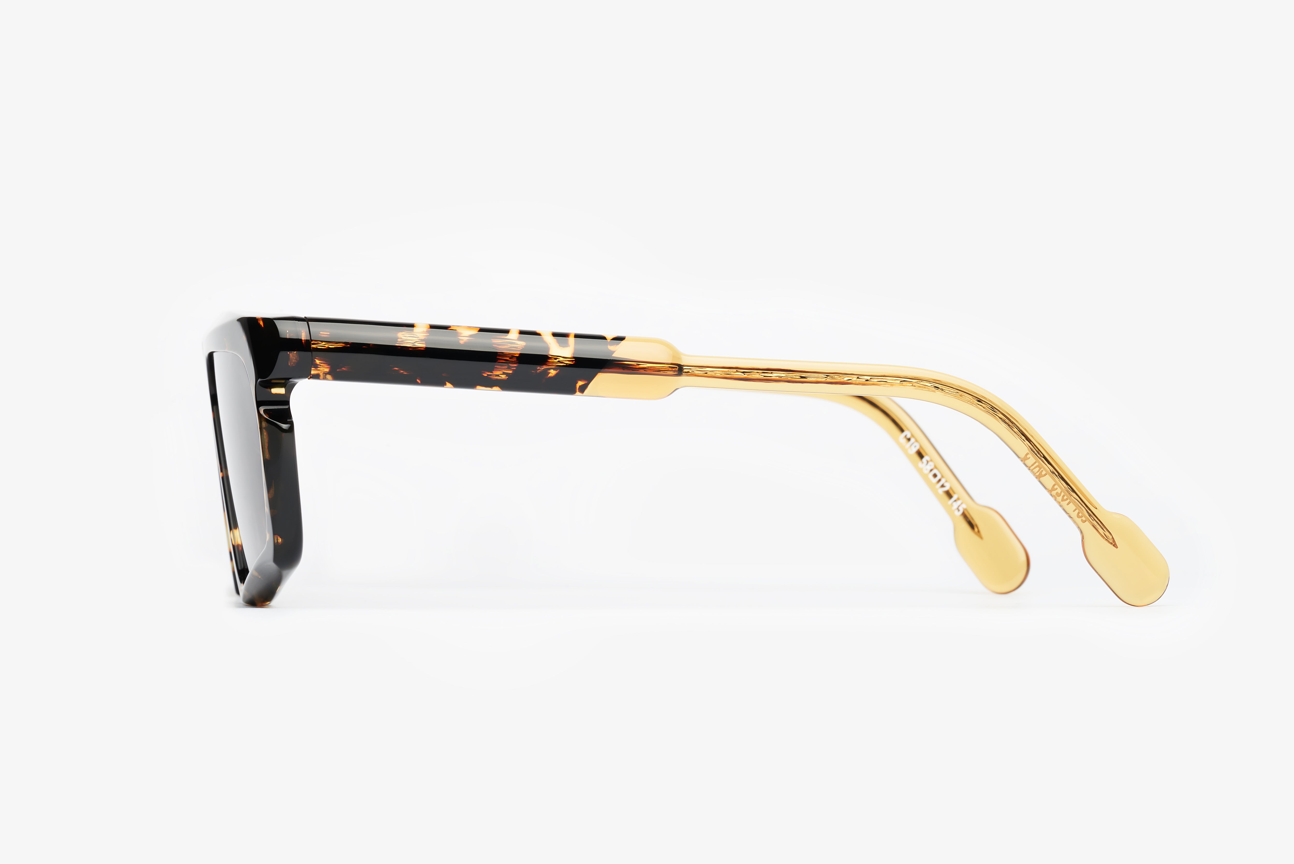The balance between sharp and round edges and the colored acetate bonding by lamination in the temples are PORTRAIT staples. The hammered visible metal components and grey-gradient lenses enrich the look of this piece.
