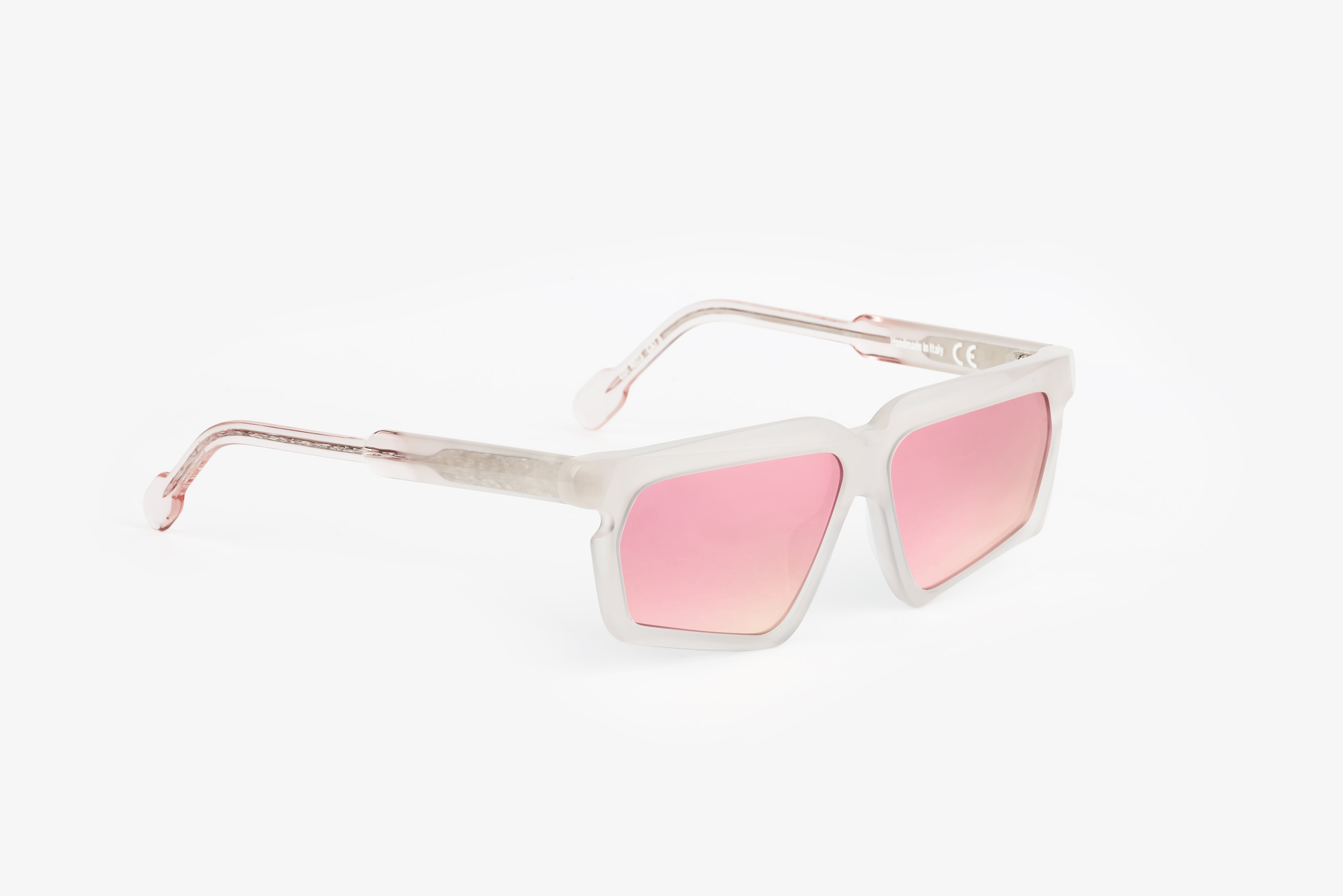 The balance between sharp and round edges and the colored acetate bonding by lamination in the temples are PORTRAIT staples. The hammered visible metal components and iridescent pink-gold mirror lenses enrich the look of this piece..