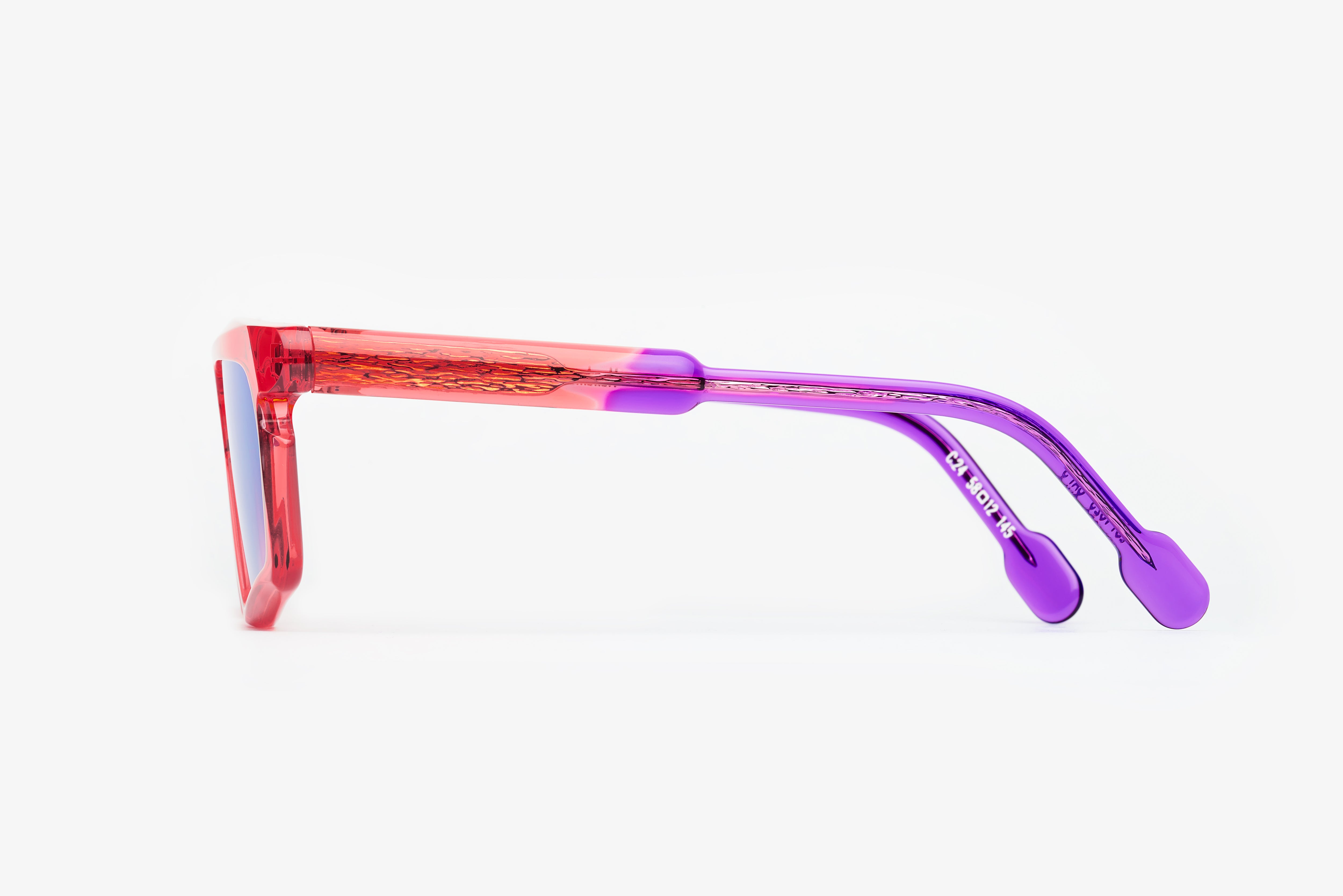 The balance between sharp and round edges and the colored acetate bonding by lamination in the temples are PORTRAIT staples. The hammered visible metal components and iridescent green-purple mirror lenses enrich the look of this piece.