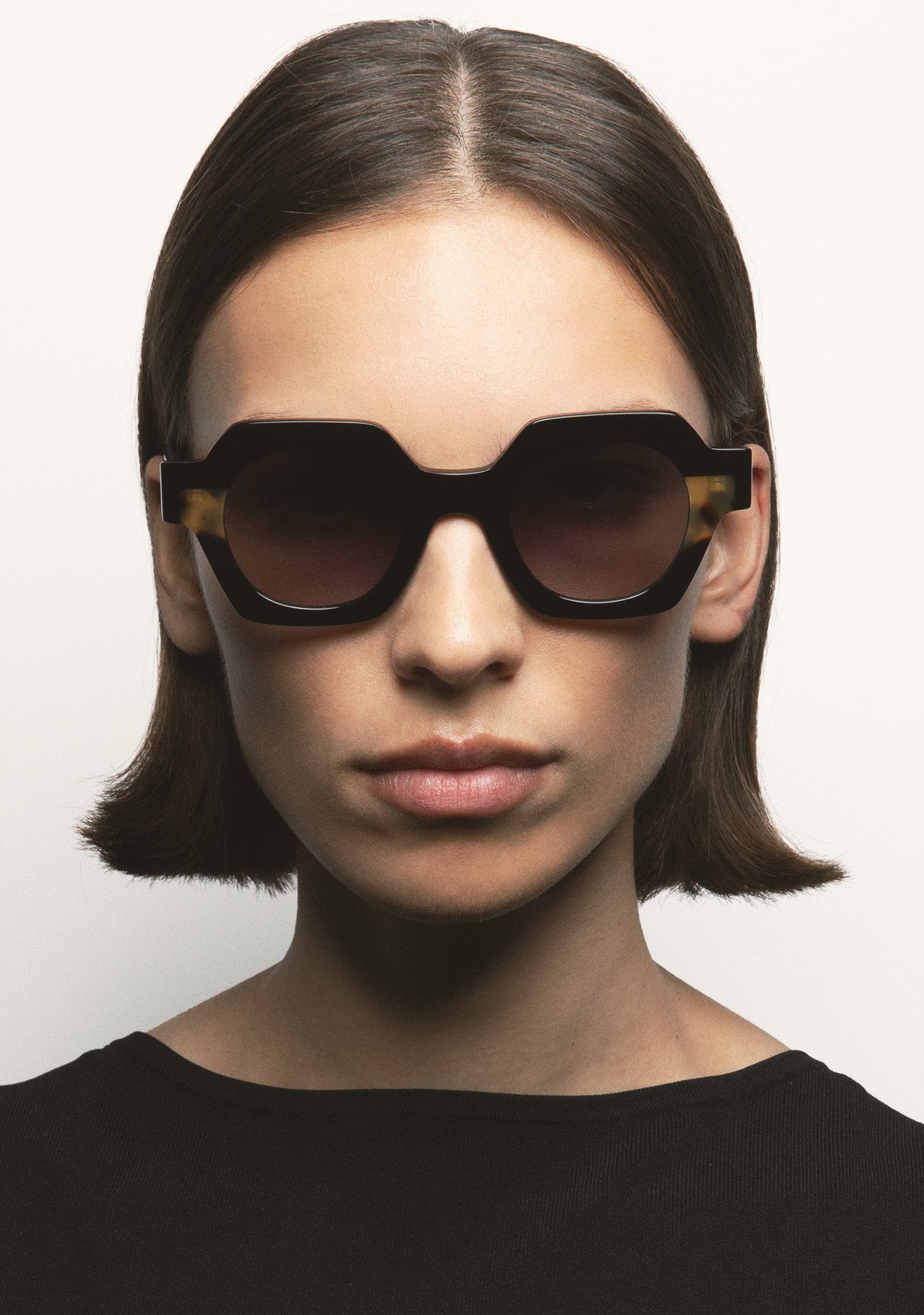 Square-shaped sunglasses. Front of black acetate with Havana brown laminate. Black acetate temples. Black gradient lens, base 2, with 100% UV protection and anti-reflective coating. Lens Category 3. Acetate nose pads incorporated. Handmade.