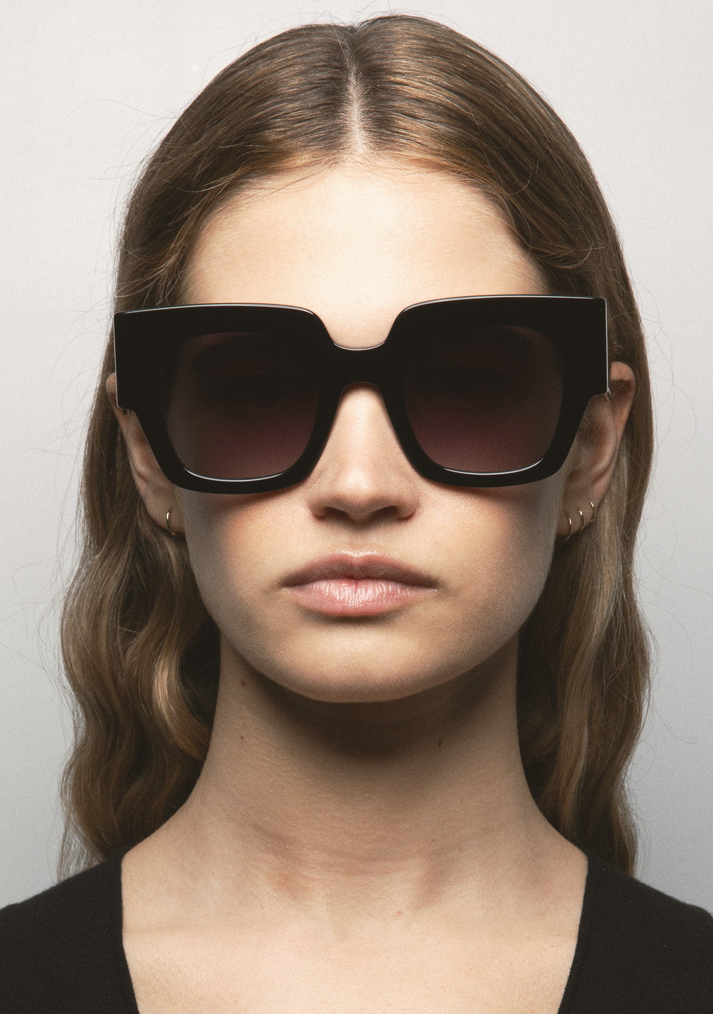 Square Sunglasses. Black acetate front with Havana brown temples. Black gradient lenses with 100% UV protection and anti-reflective coating. Category 3 lenses. Integrated acetate nose pads. Handmade.