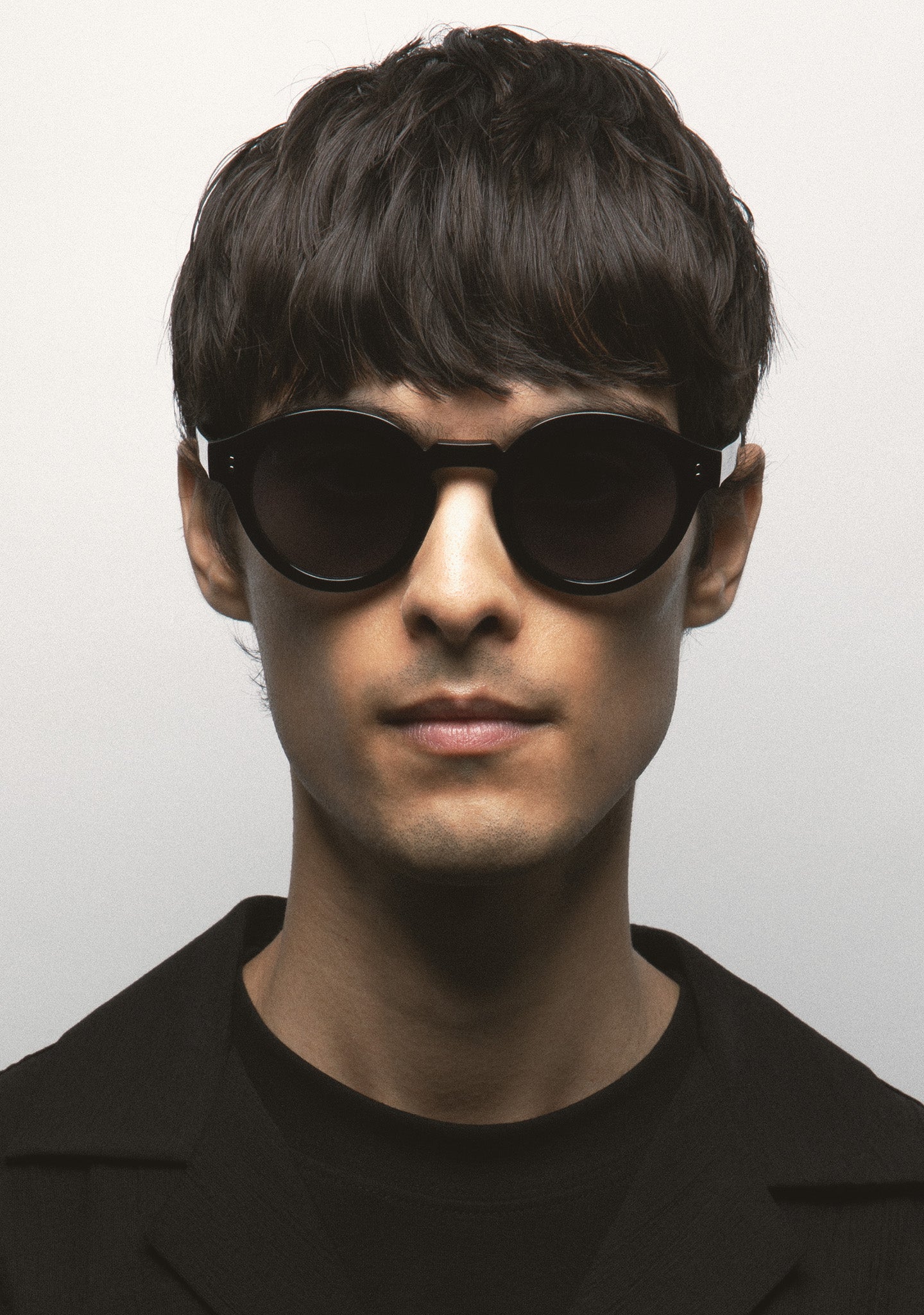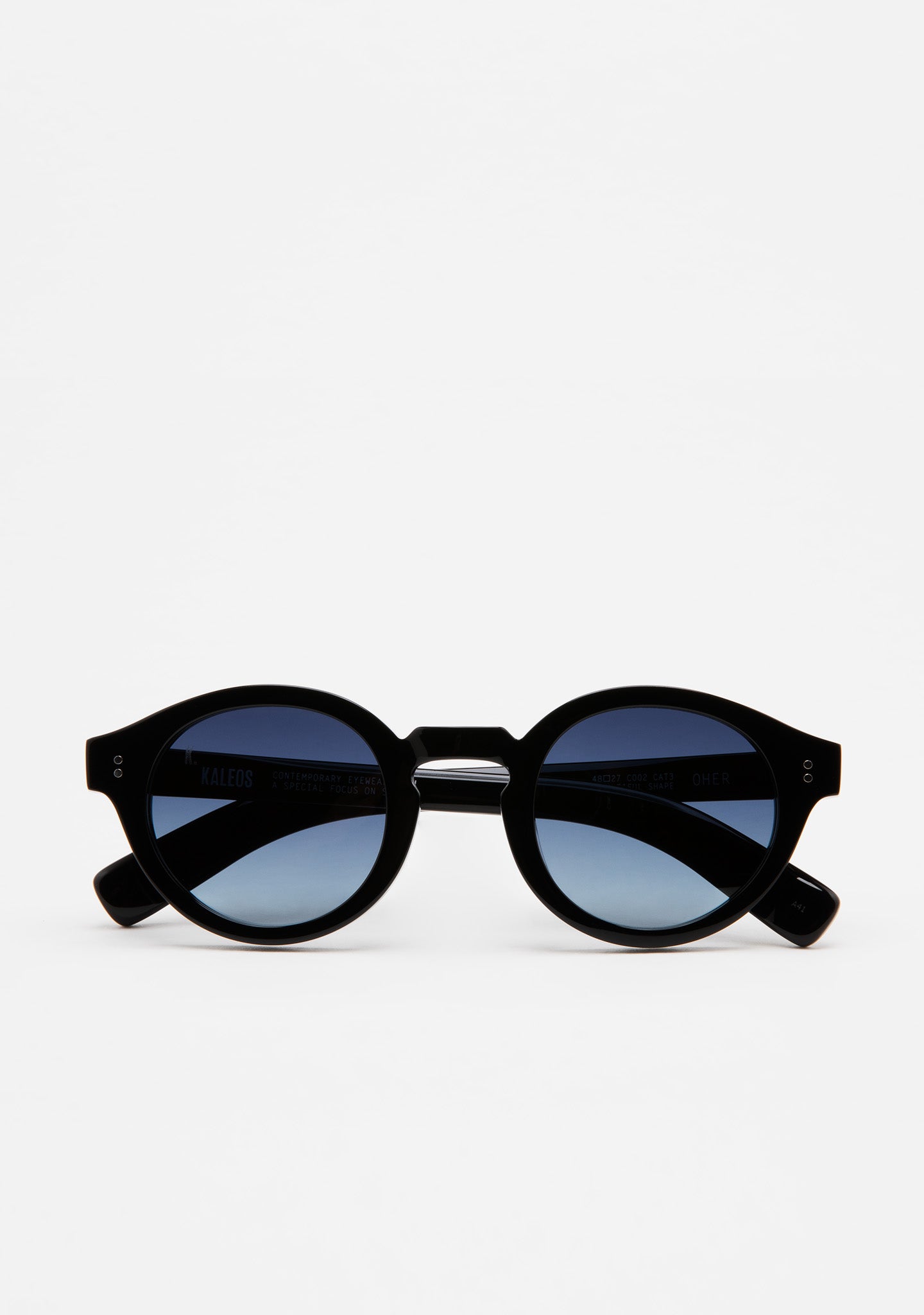 Panto shaped sunglasses with keyhole bridge. Black acetate frame front and temples. Hinges with silver rivets on end elbow pieces and temples. Dark blue tint base 2 lenses with 100% UV protection and anti-reflective treatment. Category 3 polarised lens. Built-in acetate nose pads. Handmade.