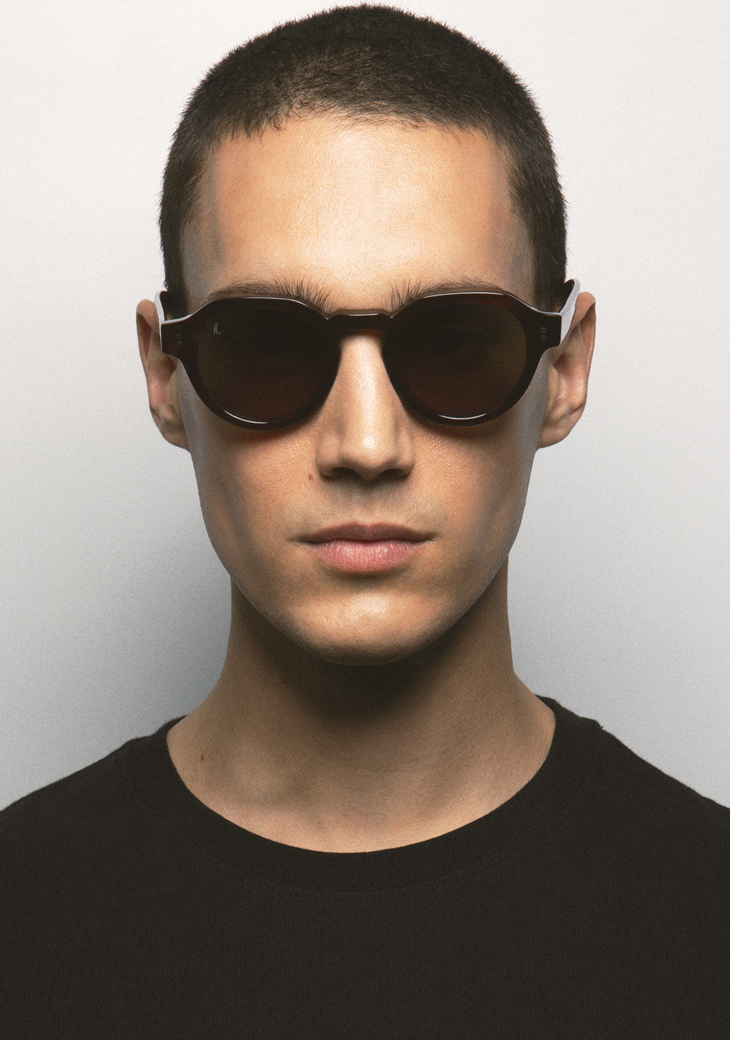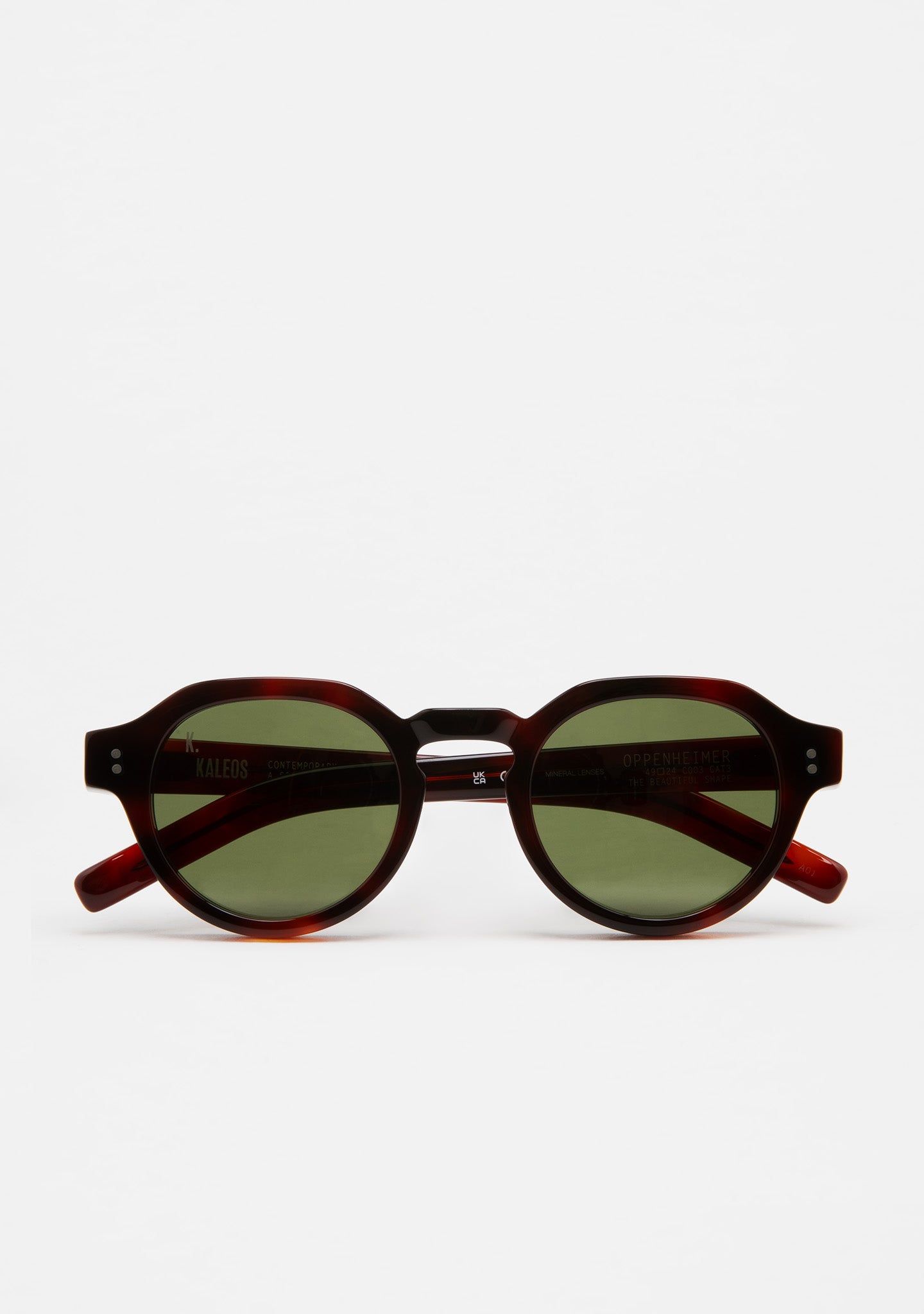 Panto shaped sunglasses with keyhole bridge and flat top bar. Thick acetate frame front in red brown tortoiseshell. Acetate temples in red brown tortoiseshell. Hinges with silver rivets on end elbow pieces and temples. Mineral green tint 2-base lenses with 100% UV protection and anti-reflective treatment. Category 2 lenses. Built-in acetate nose pads. Handmade.