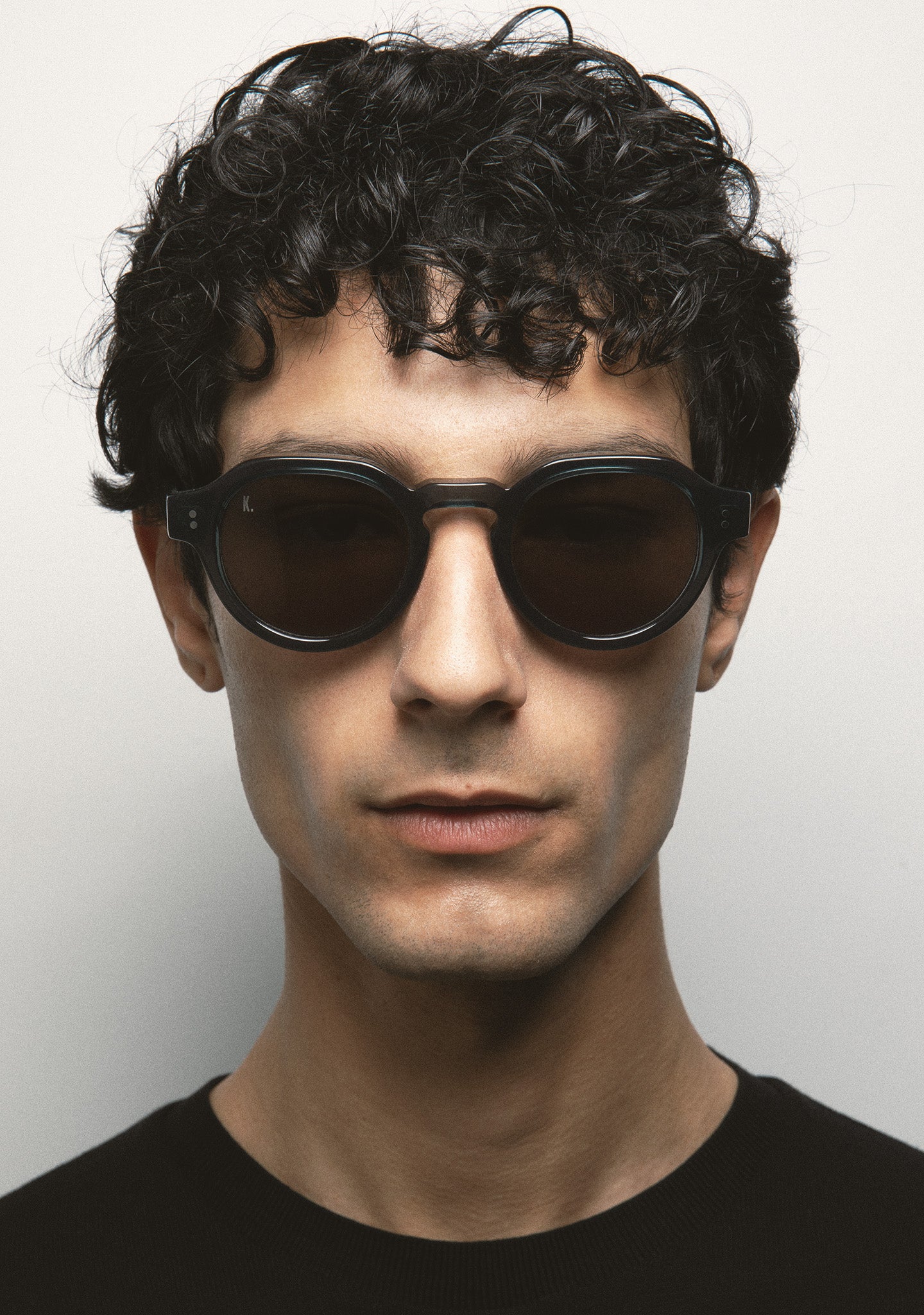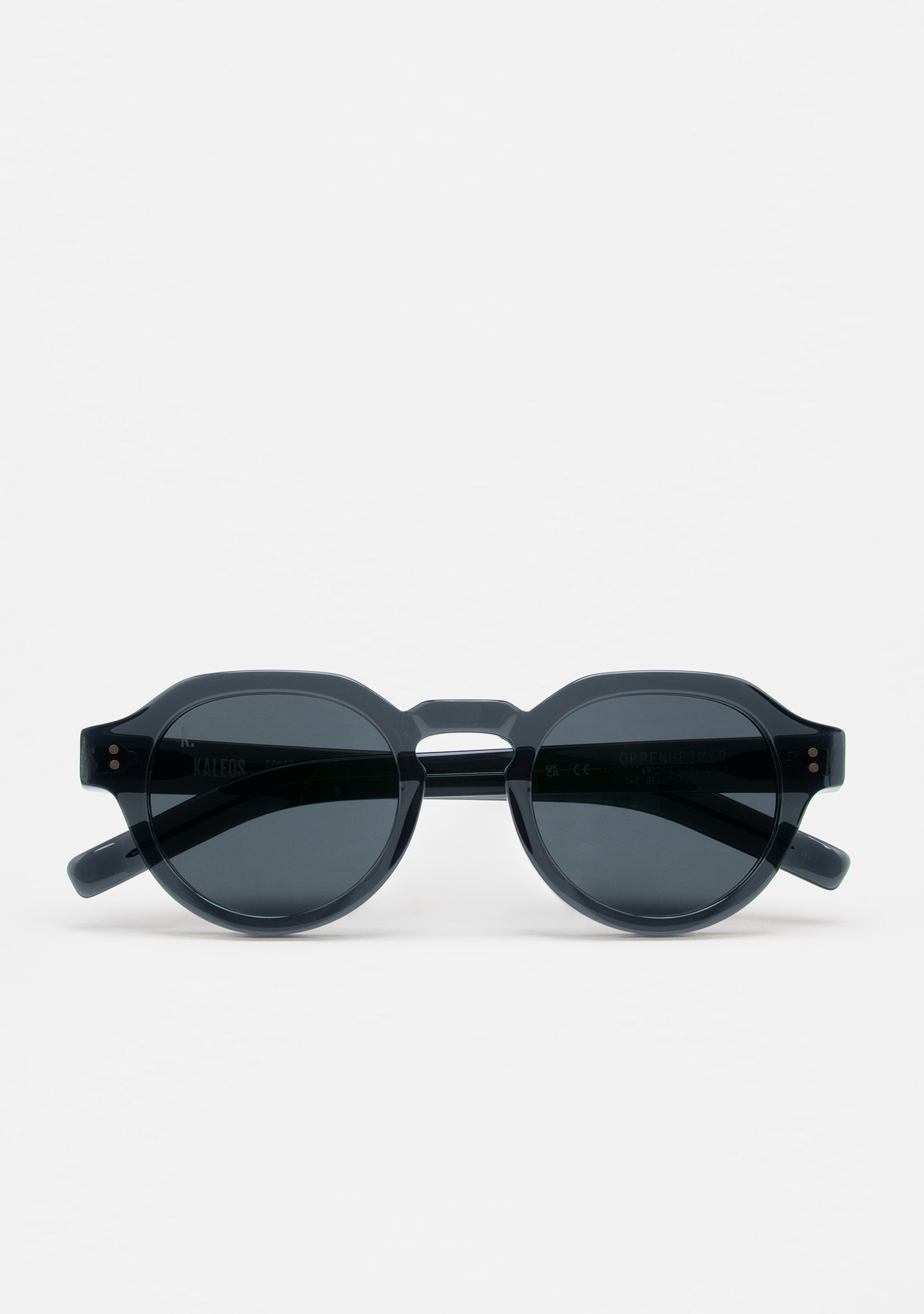 Panto shaped sunglasses with keyhole bridge and flat top bar. Thick acetate frame front in transparent dark grey. Acetate temples in transparent dark grey. Hinges with silver rivets on end elbow pieces and temples. Black gradient tint 2-base lenses with 100% UV protection and anti-reflective treatment. Category 3 lenses. Built-in acetate nose pads. Handmade.