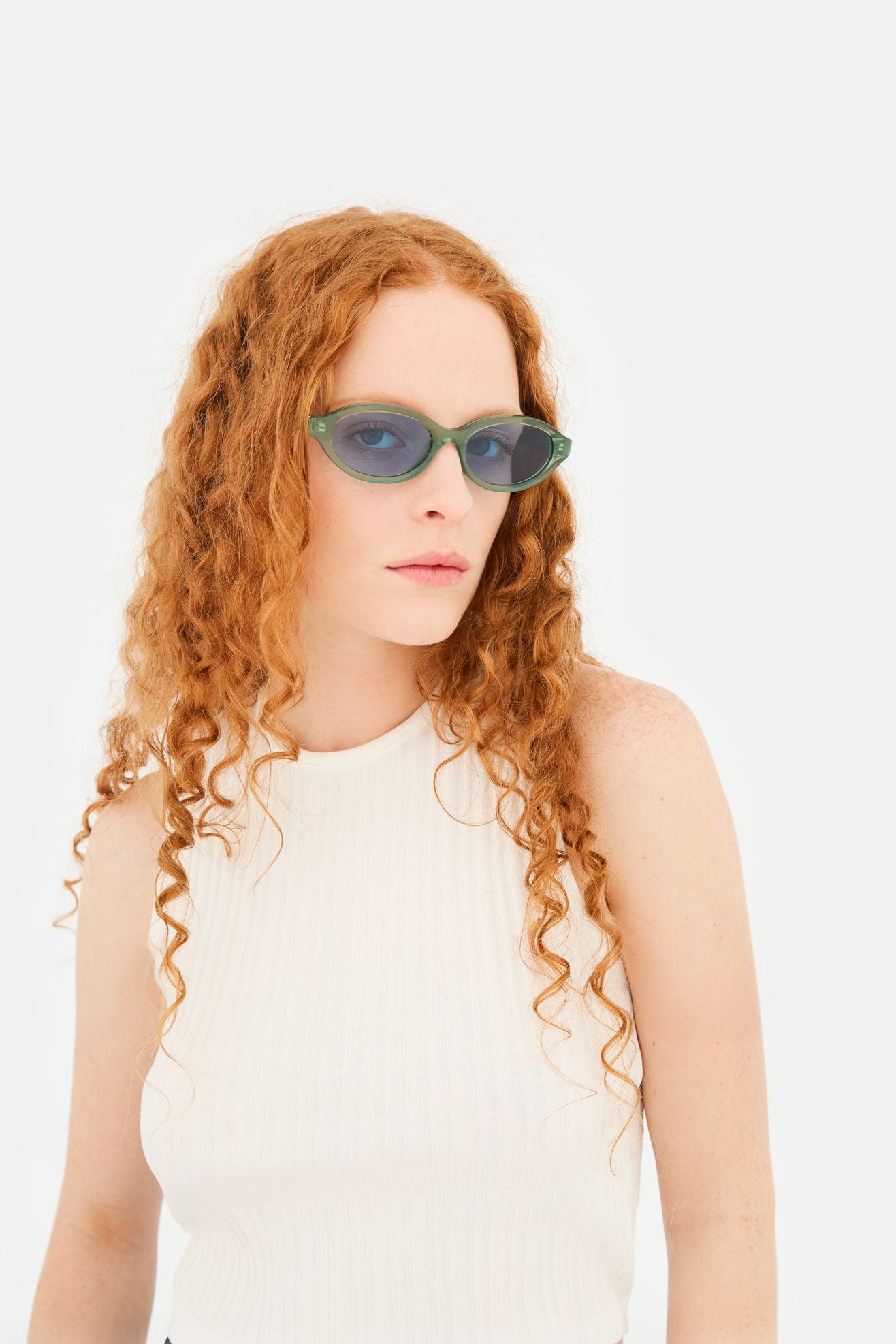 High grade Italian acetate in an elegant sage green acetate. Mounting playful blue lenses by Zeiss in base 2. Premium eyewear handmade in Italy.