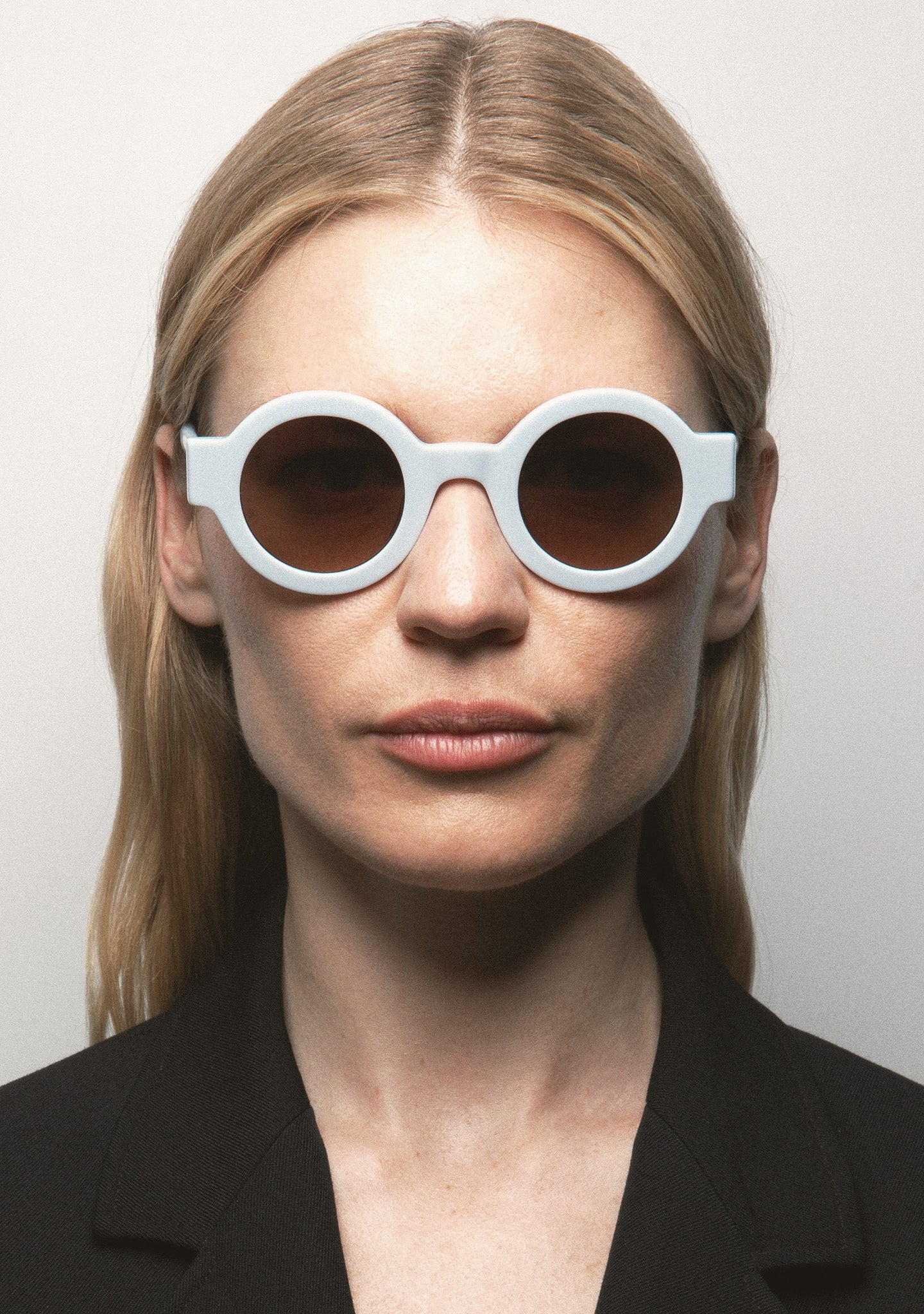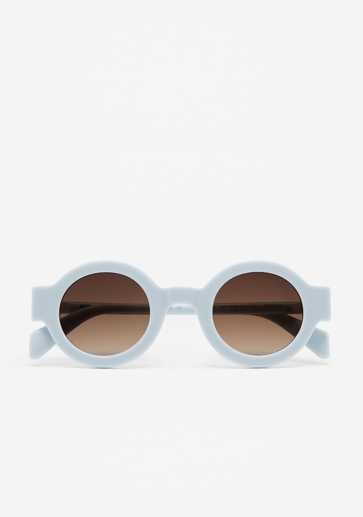 Round sunglasses. Acetate frame front and temples in light blue. Brown gradient tint 2-base lenses with 100% UV protection and anti-reflective treatment. Category 3 lenses. Built-in acetate nose pads. Handmade.