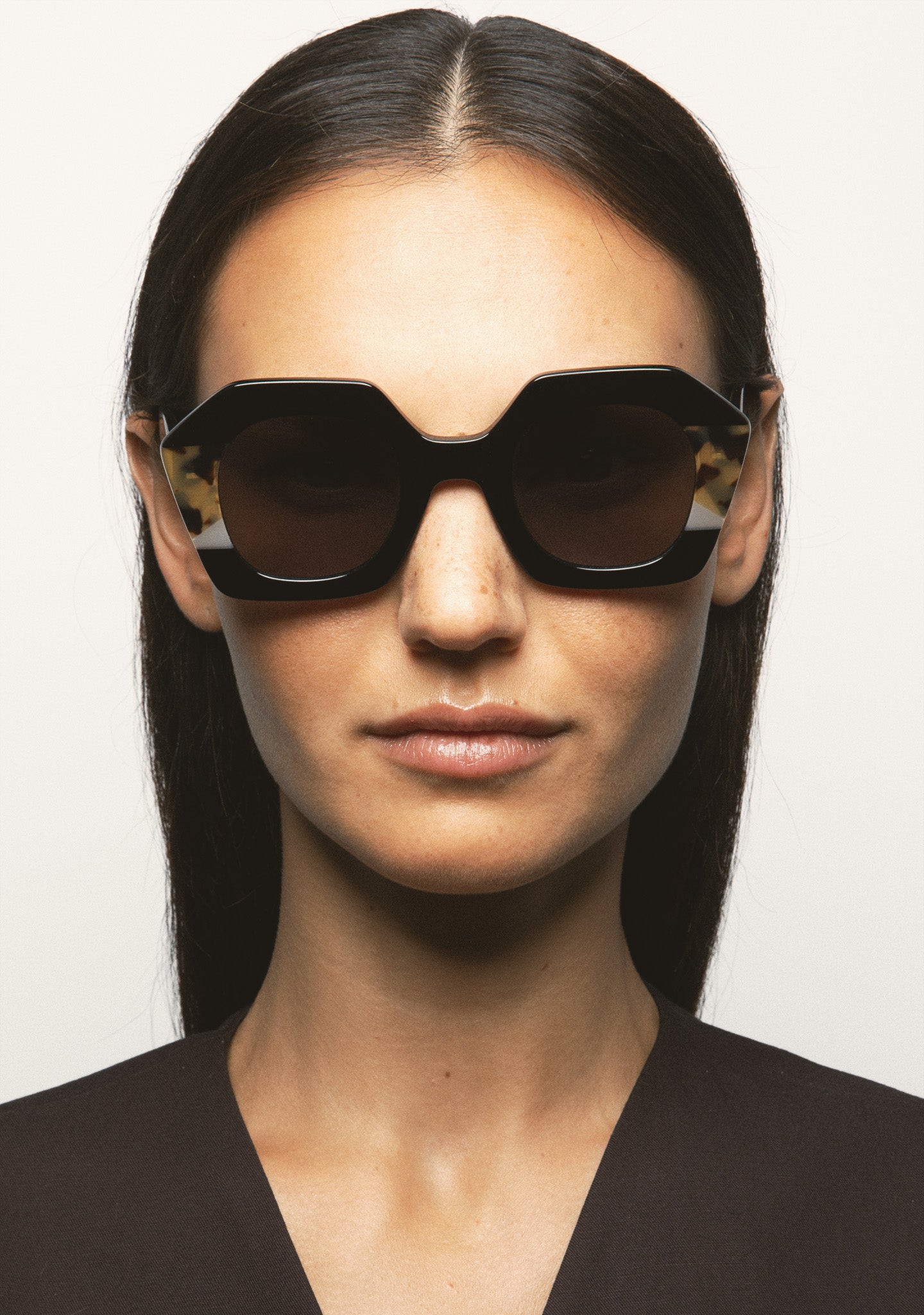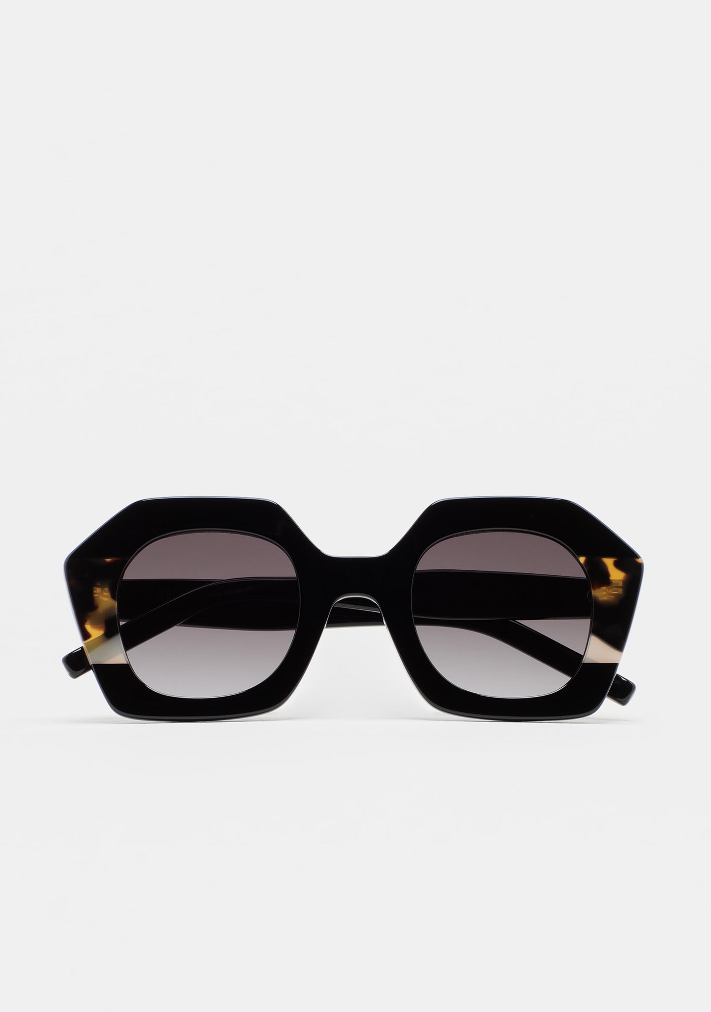 Hexagonal-shaped sunglasses. Front made of black acetate with double laminate of havana brown and translucent beige. Grey gradient lens category 3 with base 2, 100% UV protection, and anti-reflective treatment. Integrated acetate nose pads. Handmade.