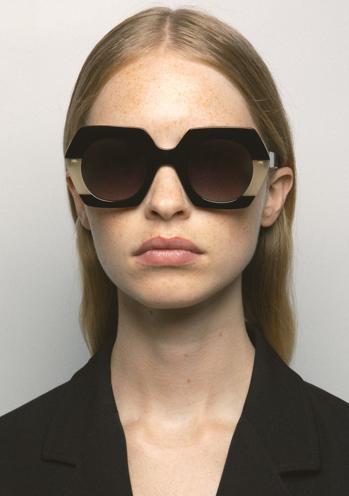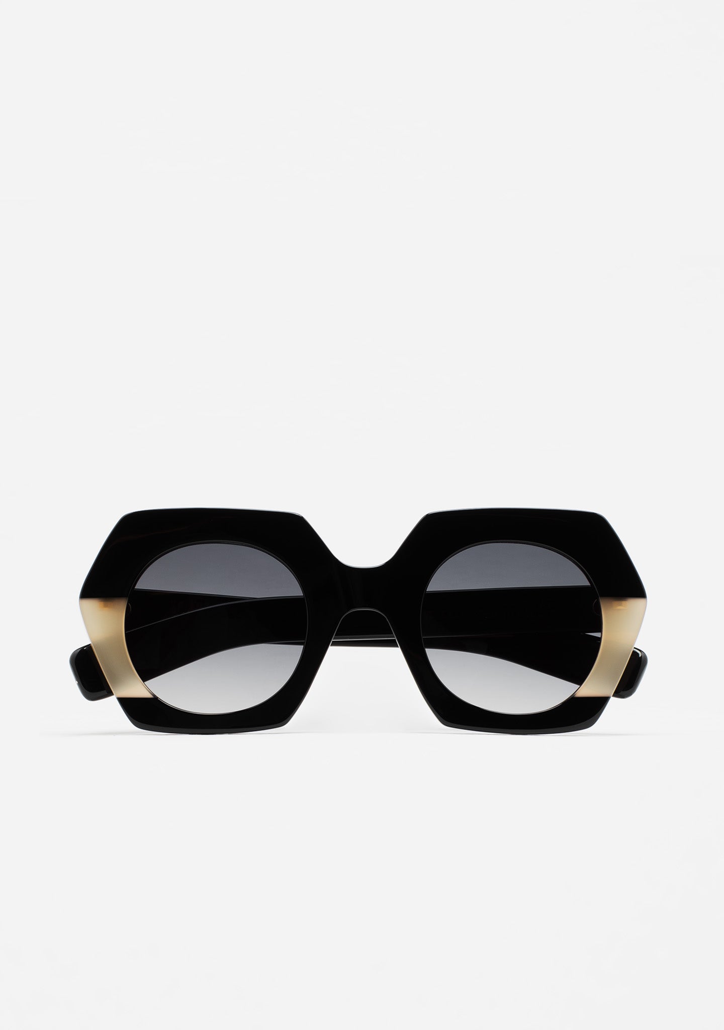 Hexagonal-shaped sunglasses. Black acetate front with translucent beige laminate. Black acetate temples. Black gradient 2-base lens with 100% UV protection and anti-reflective treatment. Category 3 lens. Built-in acetate nose pads. Handmade.
