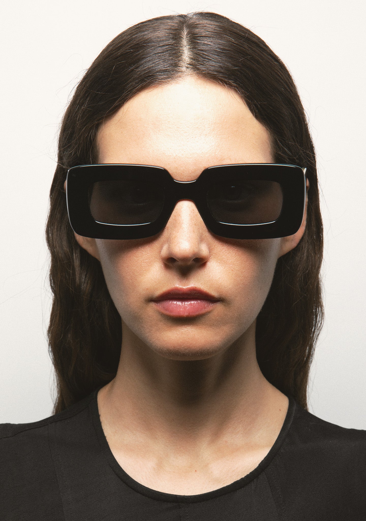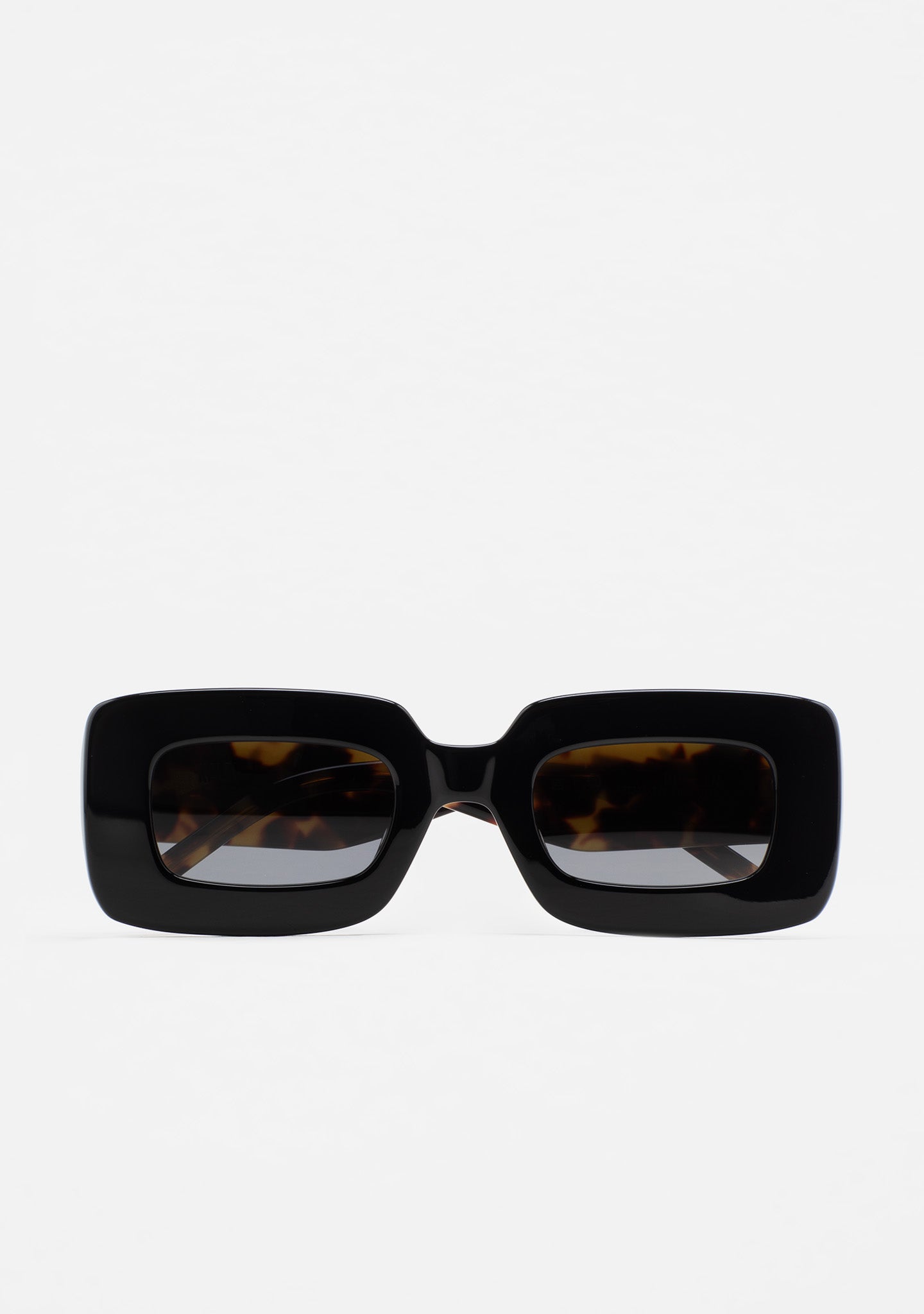 Rectangular-shaped sunglasses. Black acetate front with brown tortoiseshell acetate temples. Gray 2-base lens with 100% UV protection and anti-reflective treatment. Category 3 lenses. Built-in acetate nose pads. Handmade.