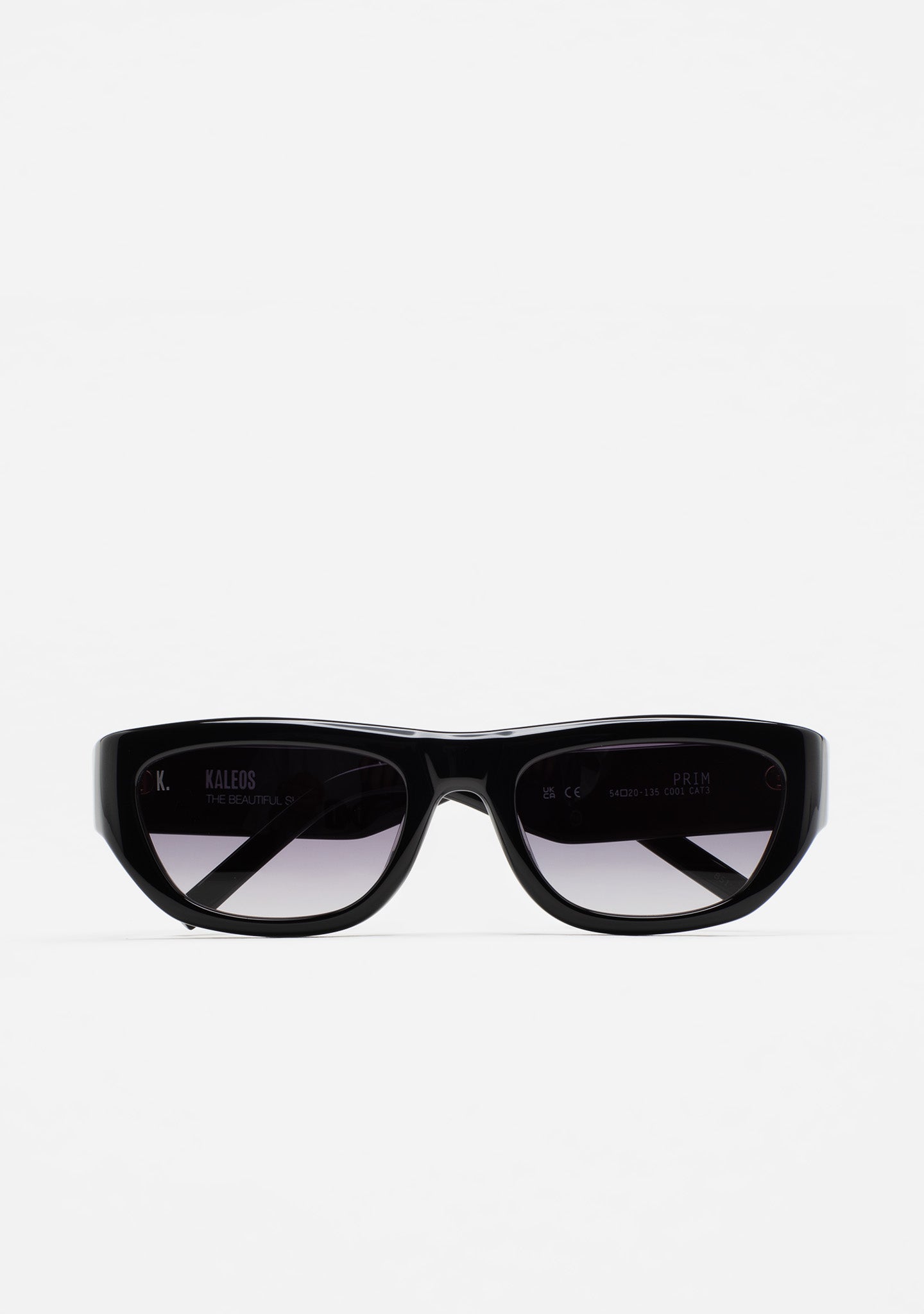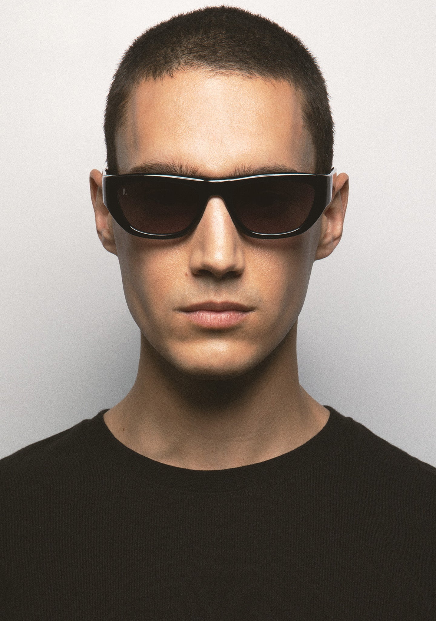 Poliedric-shaped sunglasses with rounded edges. Black acetate front and temples. Curved heel-temple design. Black gradient 2-base lens with 100% UV protection and anti-reflective treatment. Category 3 lenses. Built-in acetate nose pads. Handmade.