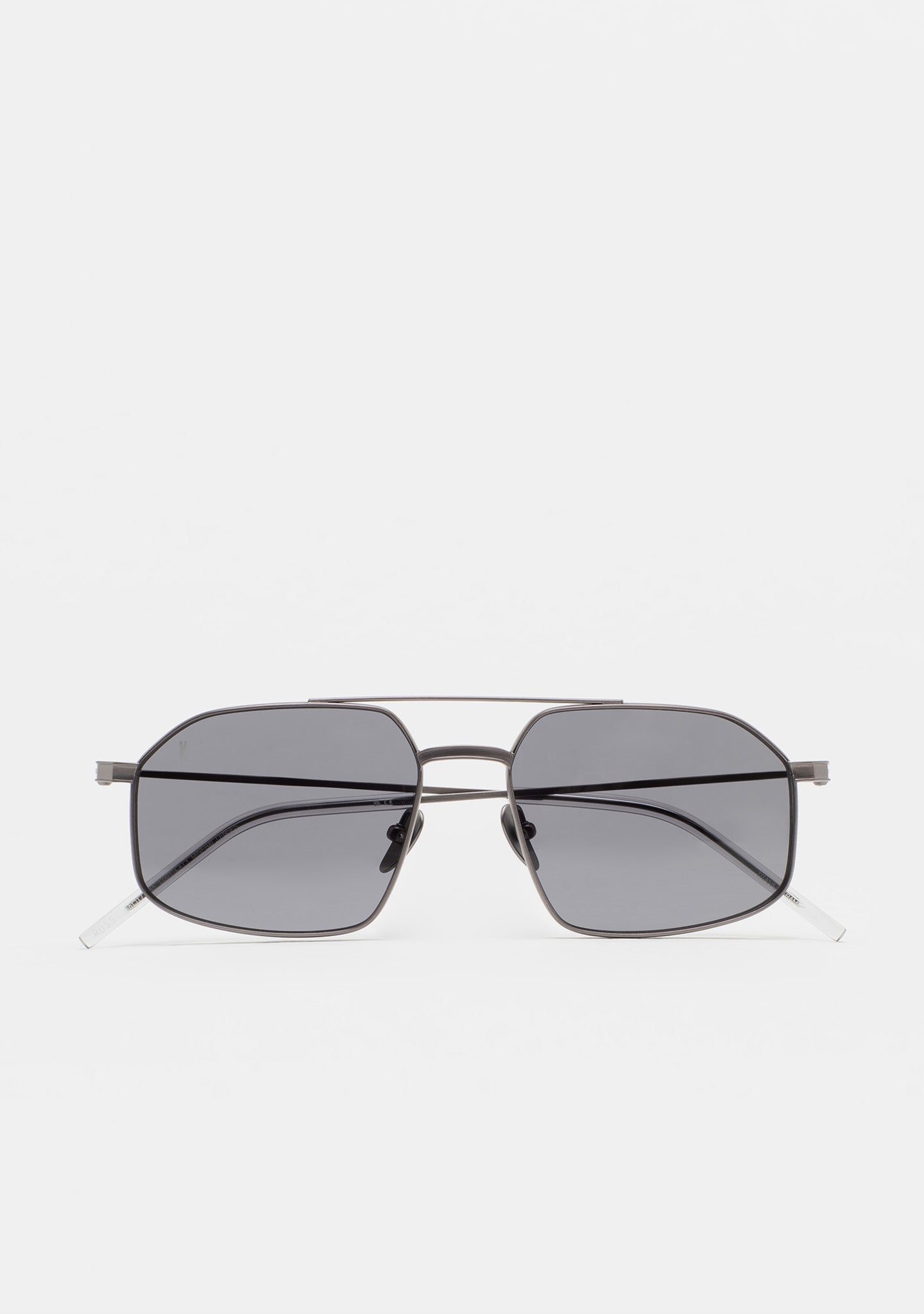 Rectangular sunglasses with double bridge. Matte dark silver titanium front and temples. Temples end in transparent gray acetate tips. Gray mineral lenses, base 2, with 100% UV protection and anti-reflective coating. Category 3 lenses. Integrated nose pads. Handmade.