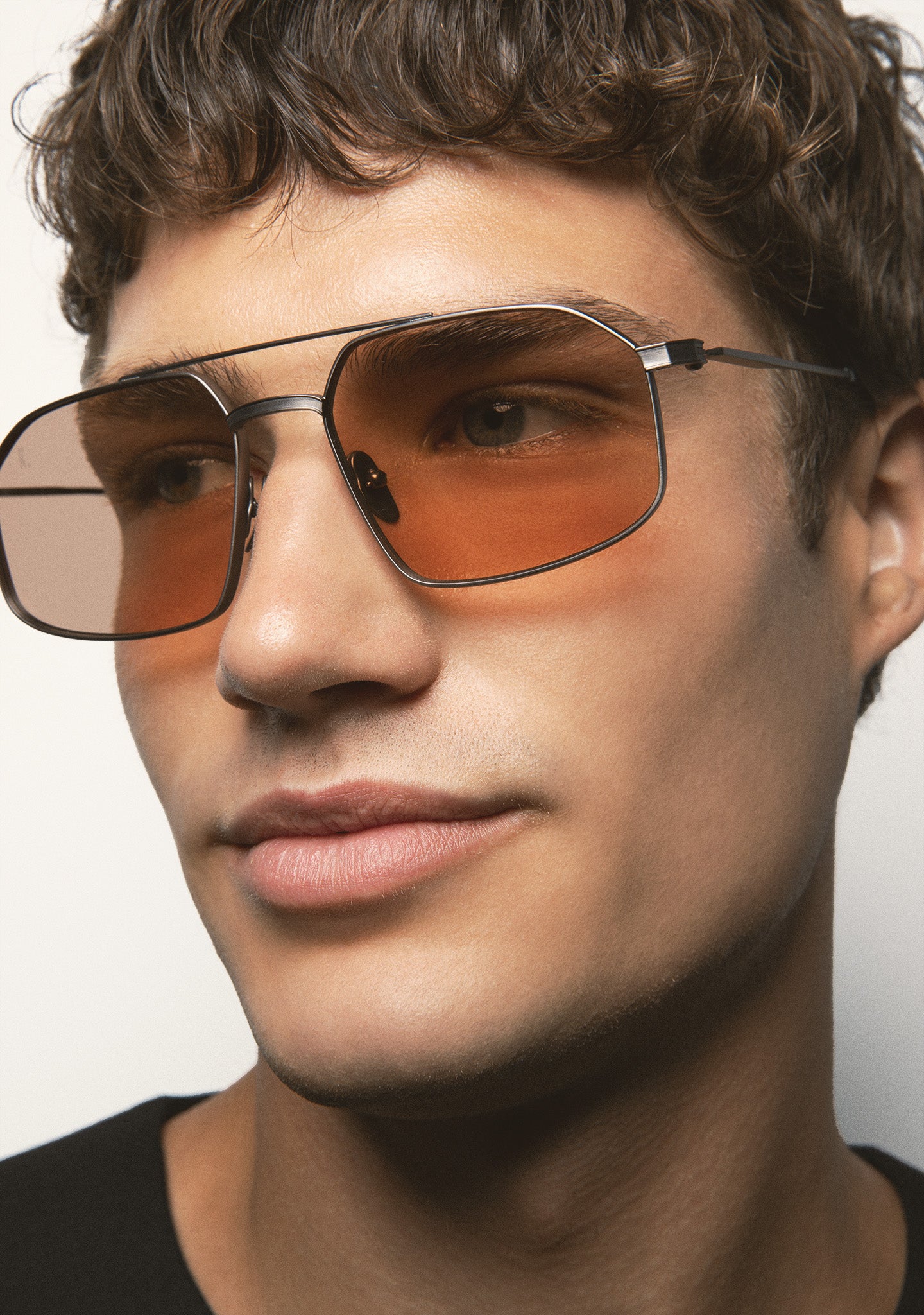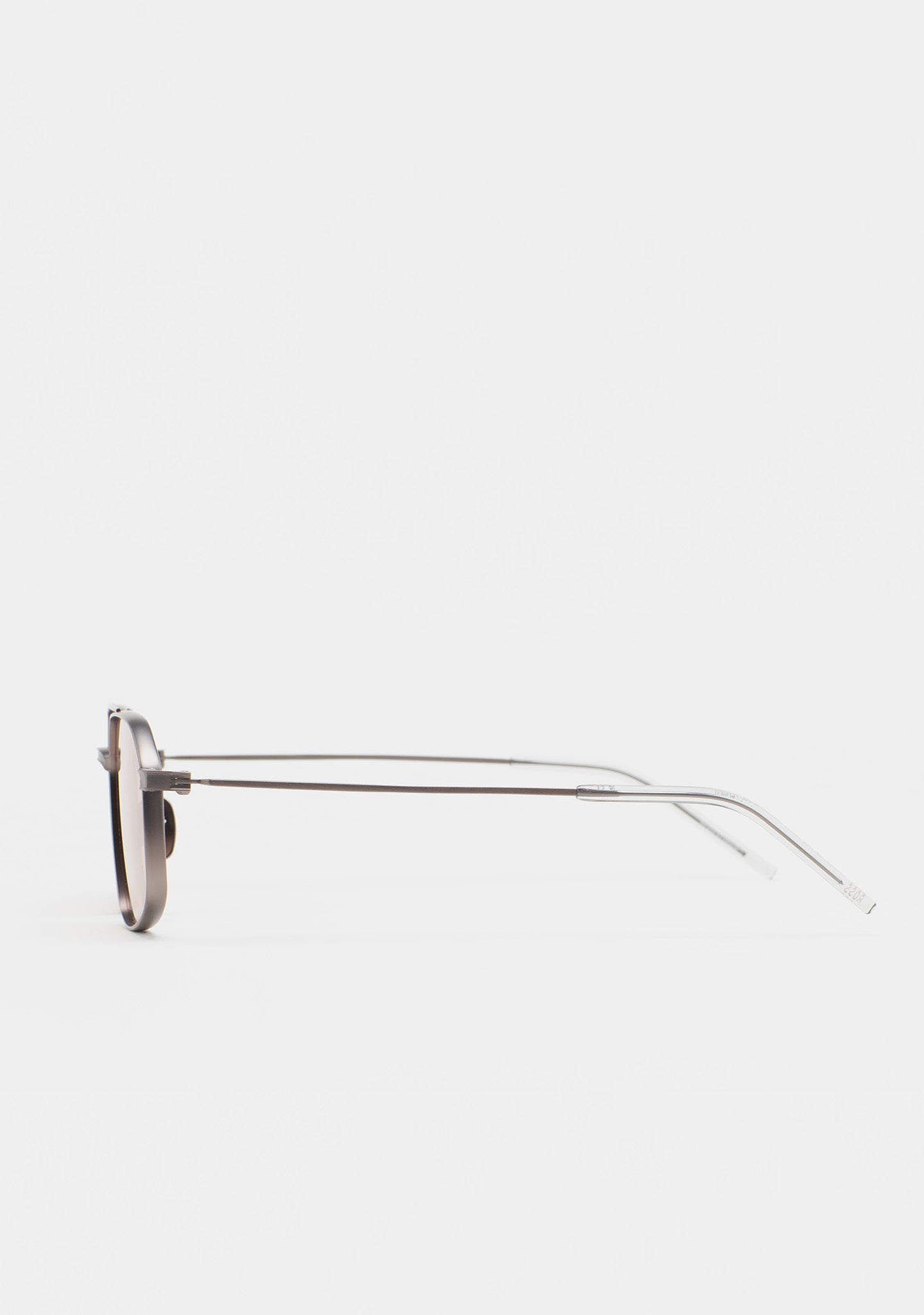 Rectangular sunglasses with double bridge. Silver titanium front and temples. Temples end in transparent gray acetate tips. Green photochromic lenses, base 2, with 100% UV protection and anti-reflective coating. Category 1 3 lenses. Integrated nose pads. Handmade.