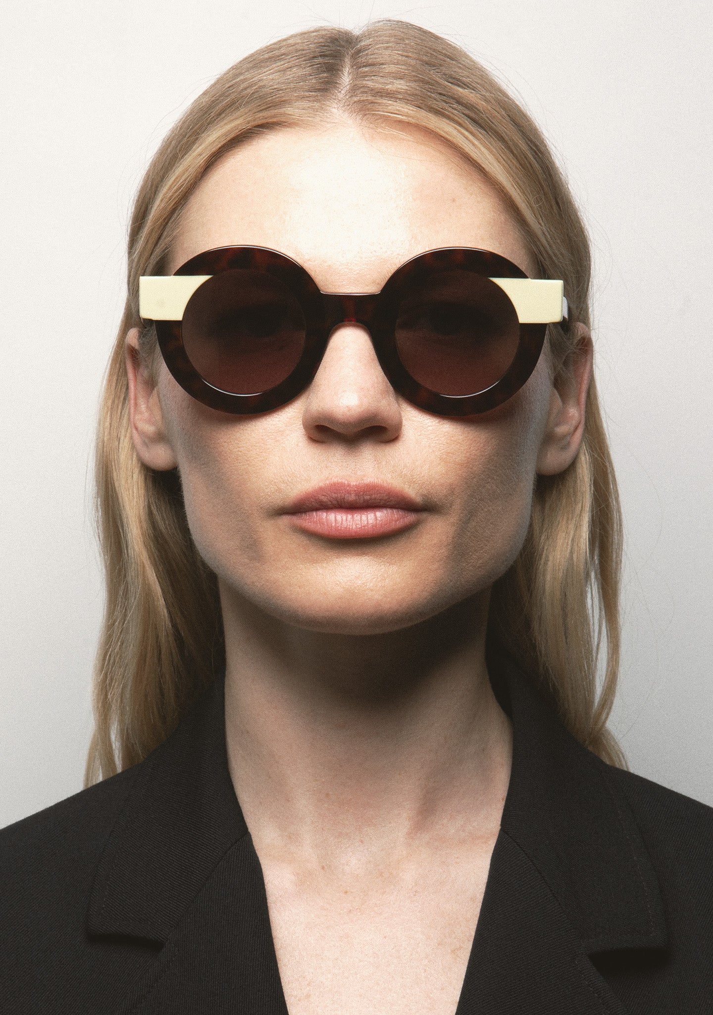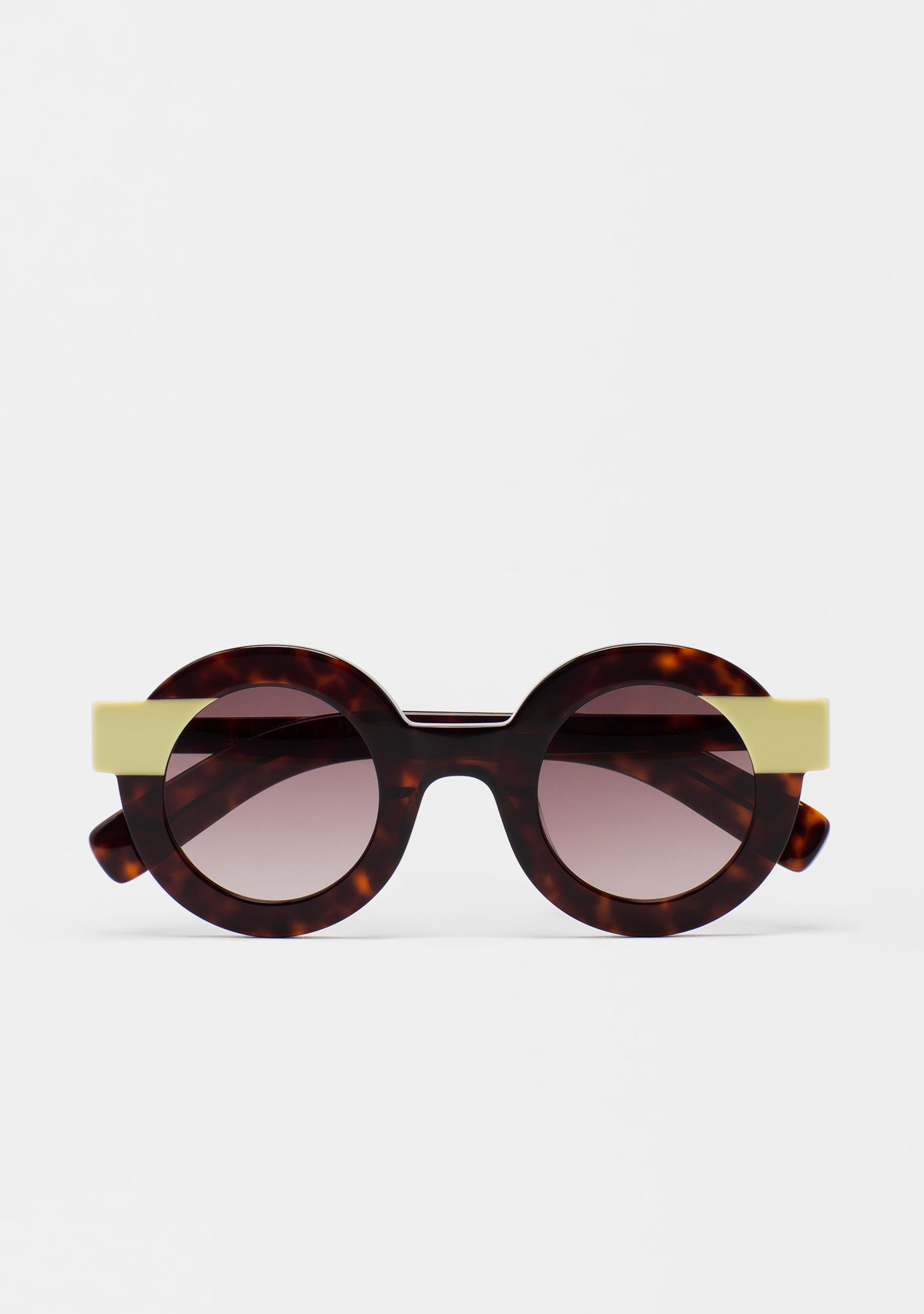 Sunglasses in dark brown tortoiseshell acetate with yellow laminate. Round shape. Acetate temples. Brown gradient tint base 2 lenses with 100% UV protection at the acetate level, and anti-reflective treatment. Category 3 lenses. Built-in acetate nose pads. Handmade.