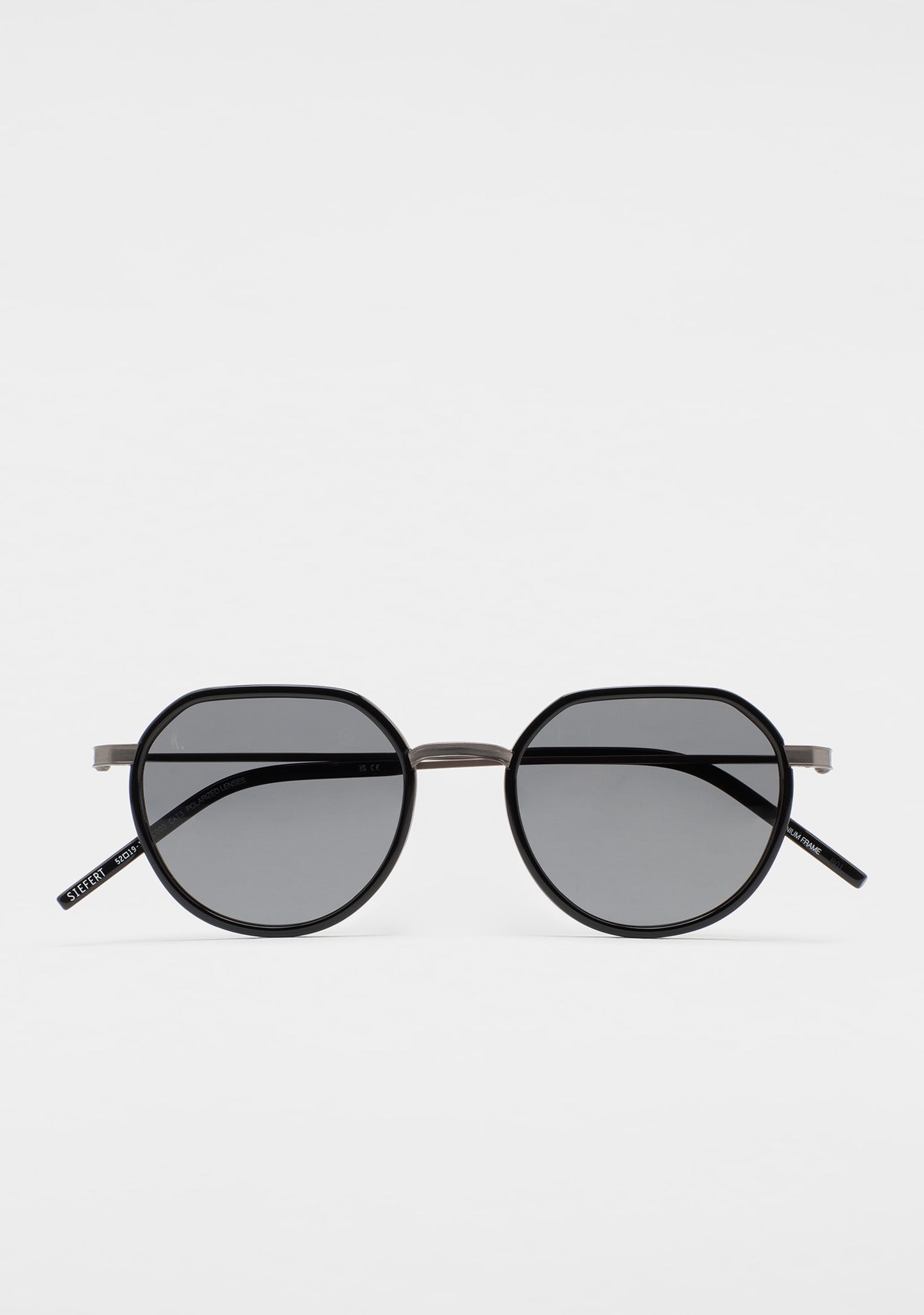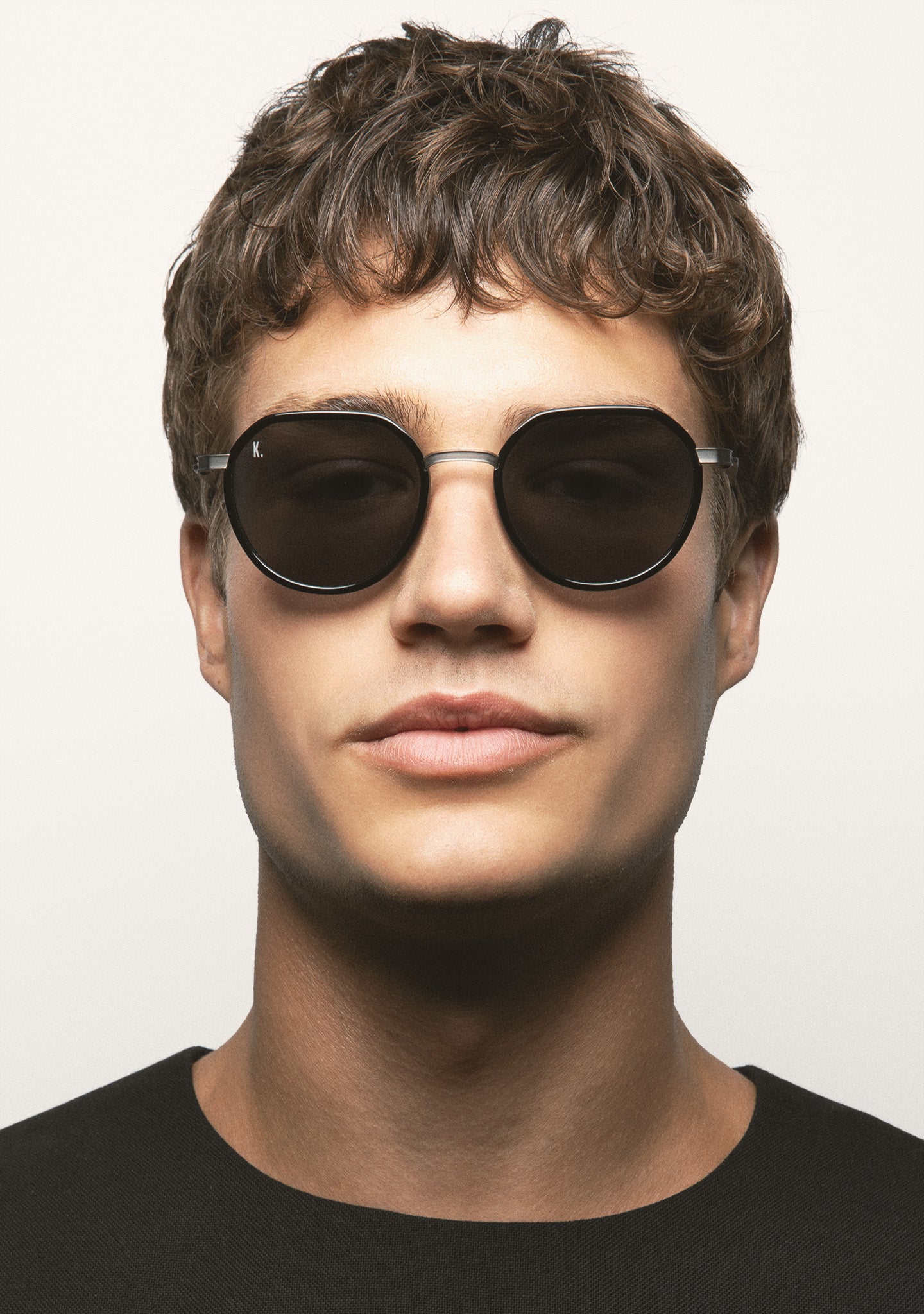 Pantos-shaped sunglasses with a slightly straighter top. Matte dark gray titanium front with black high-density acetate rim. Matte dark gray titanium temples and bridge. Black acetate temple tips. Polarized gray lens, base 2, with 100% UV protection and anti-reflective treatment. Category 3 lens. Integrated acetate nose pads. Handmade.