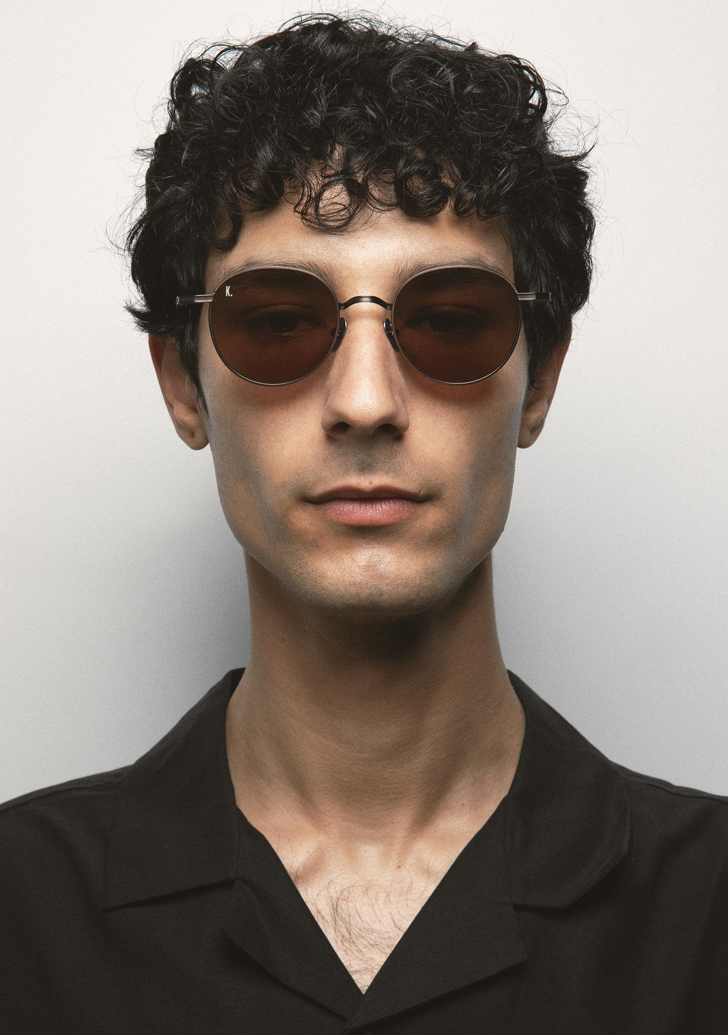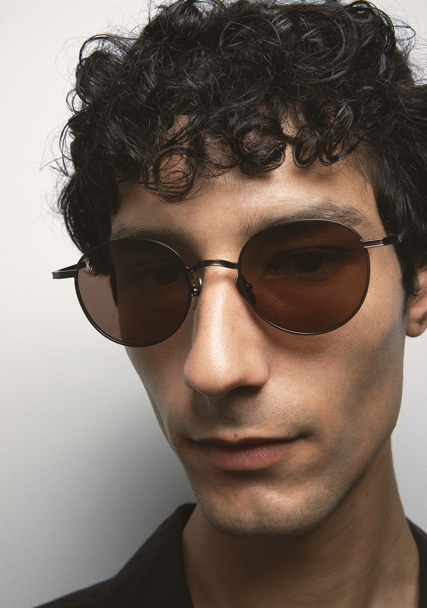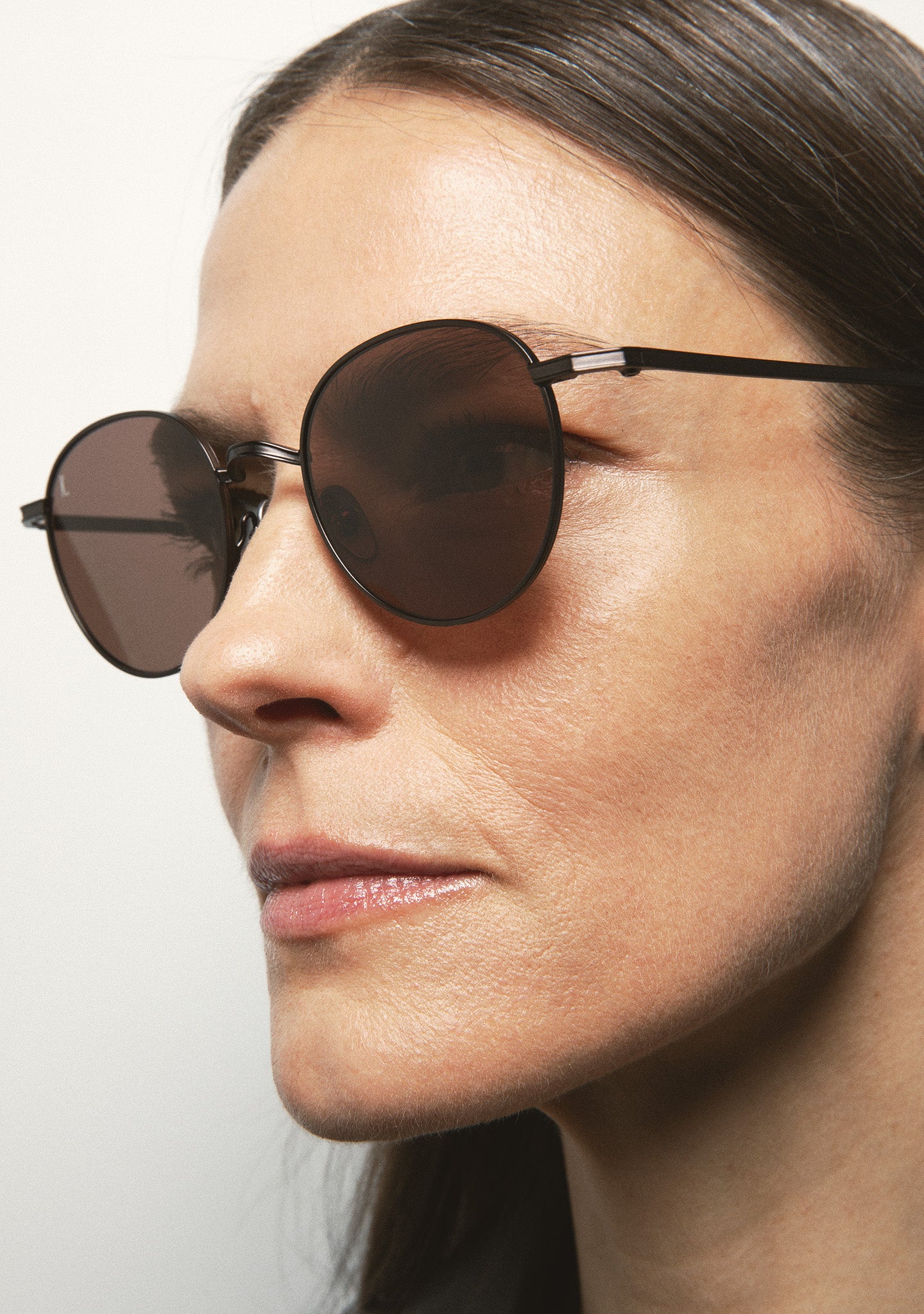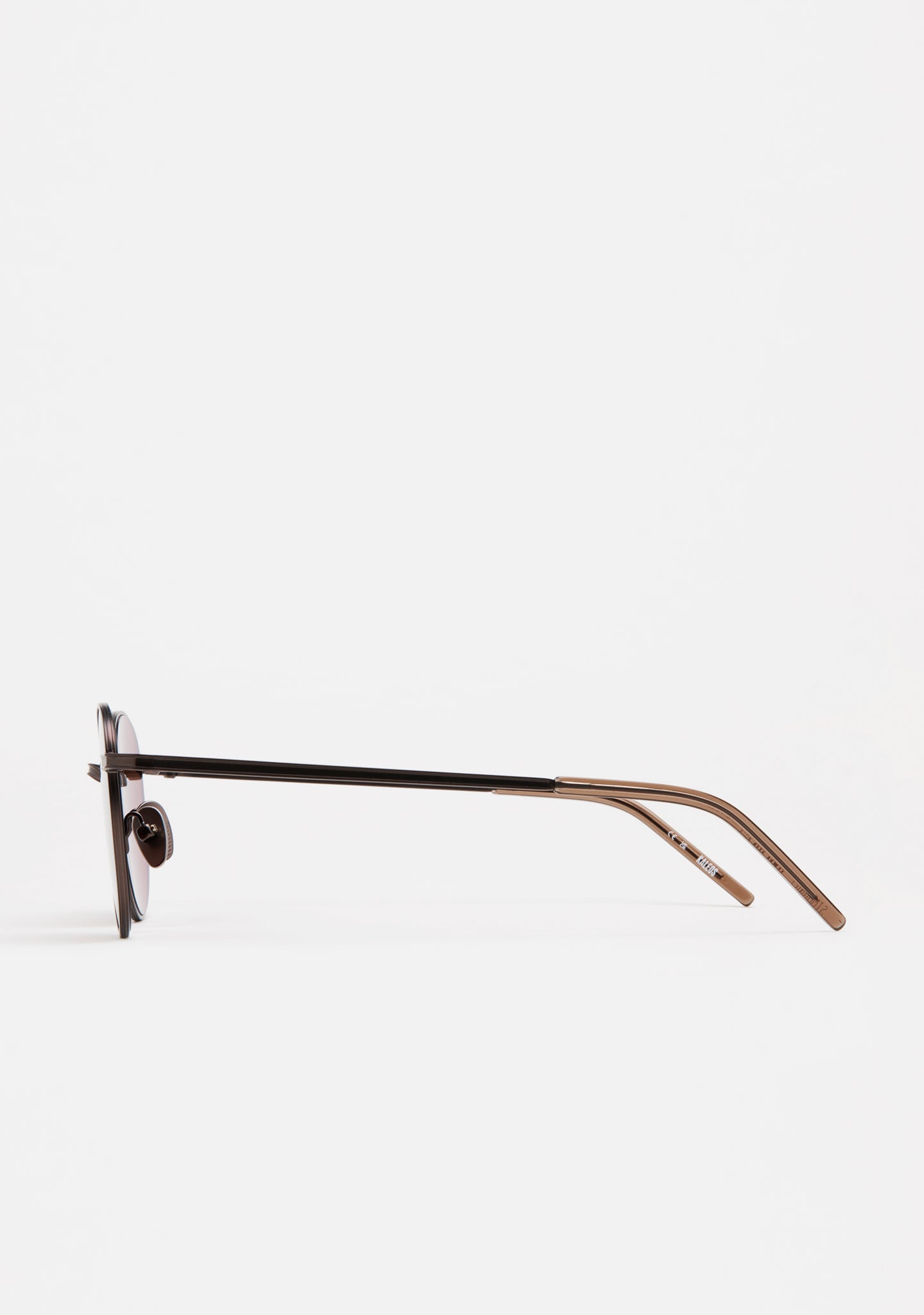 Panto shaped sunglasses. Brushed dark brown stainless steel structure. Temples and bridge with grooves along the profile. Temples with acetate tips. Brown tint gradient 2-base lenses with 100% UV protection and anti-reflective treatment. Category 3 lenses. Built-in stainless steel nose pads. Handmade.