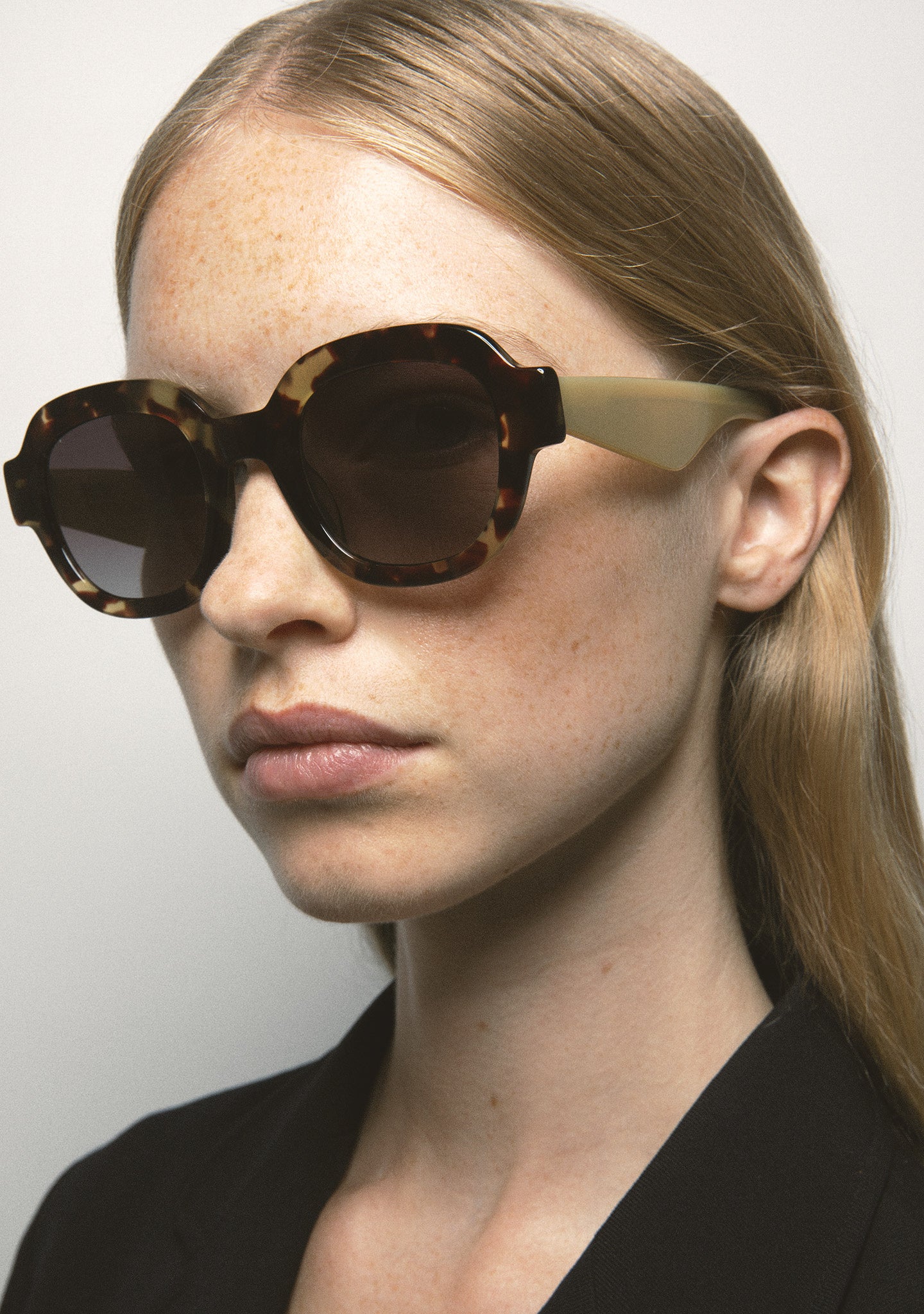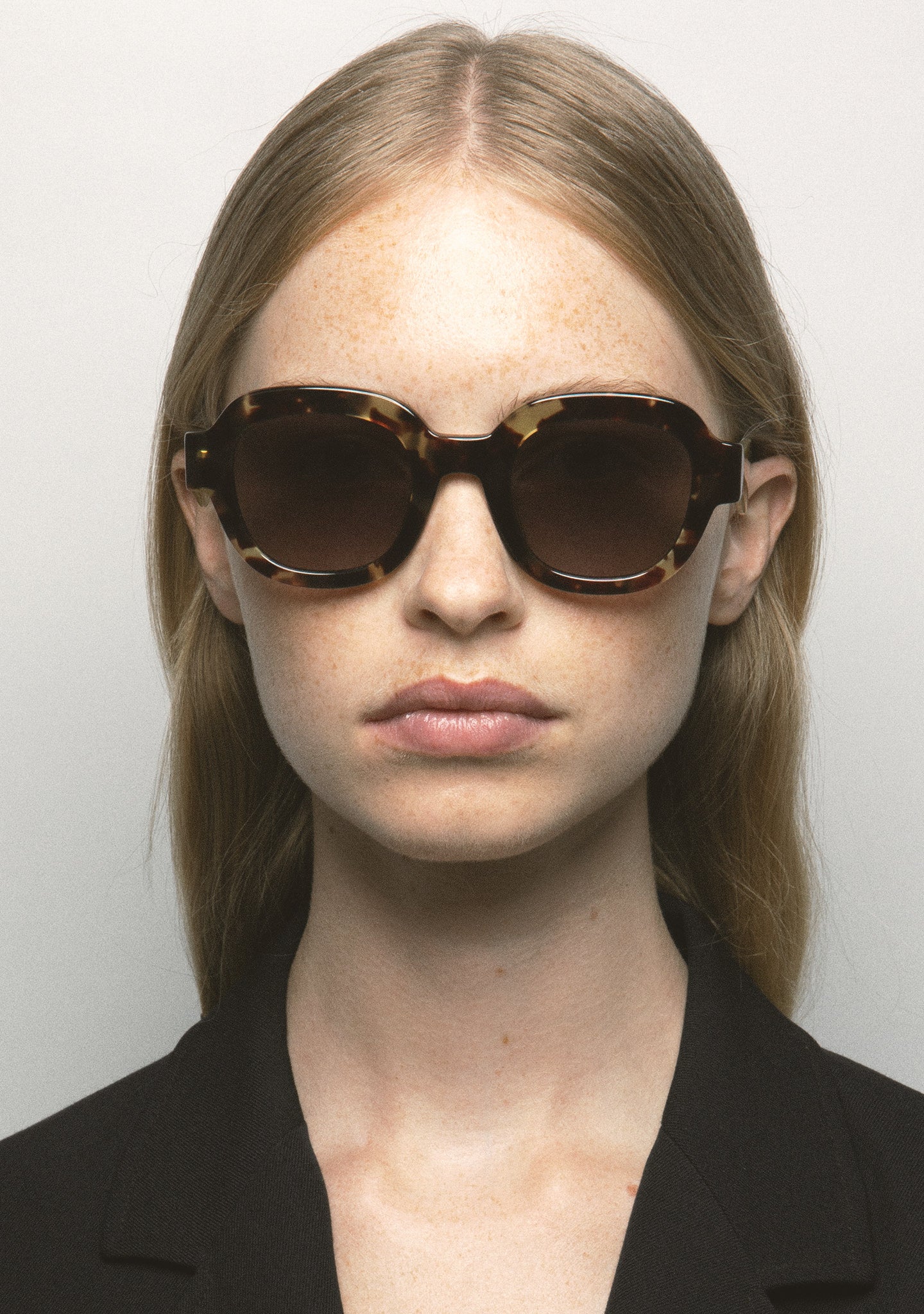 Square-shaped sunglasses. Black acetate front with brown tortoiseshell acetate temples. Black gradient 2-base lens with 100% UV protection and anti-reflective treatment. Category 3 lenses. Built-in acetate nose pads. Handmade.