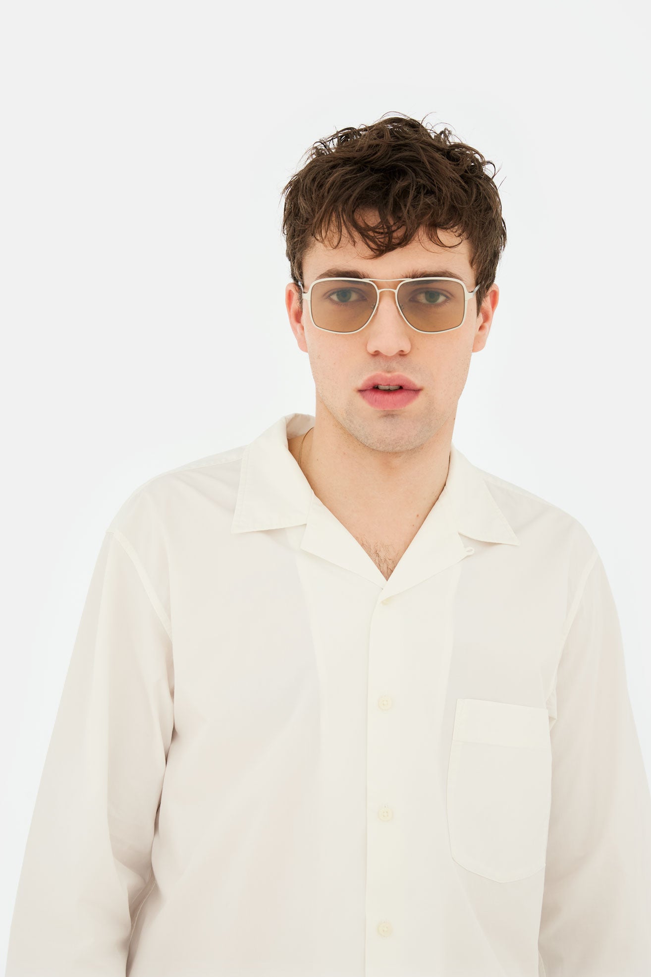High grade metal milled from compressed multi-sheet with a silver galvanic. Mounting refined mustard yellow mineral tempered glass lenses in base 2. Adjustable acetate temple tips for extra comfort and fit. Premium eyewear designed in Milano, Italy.
