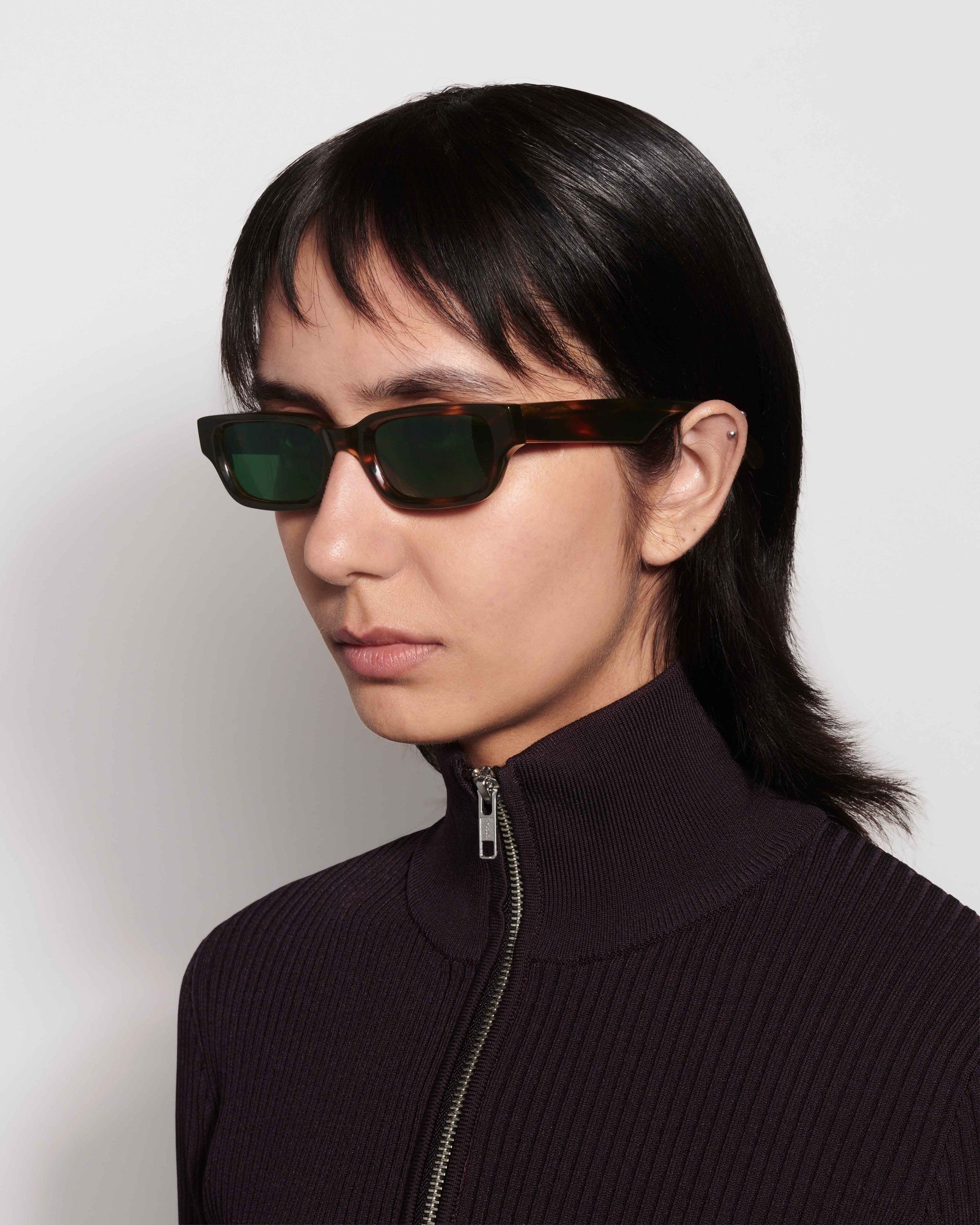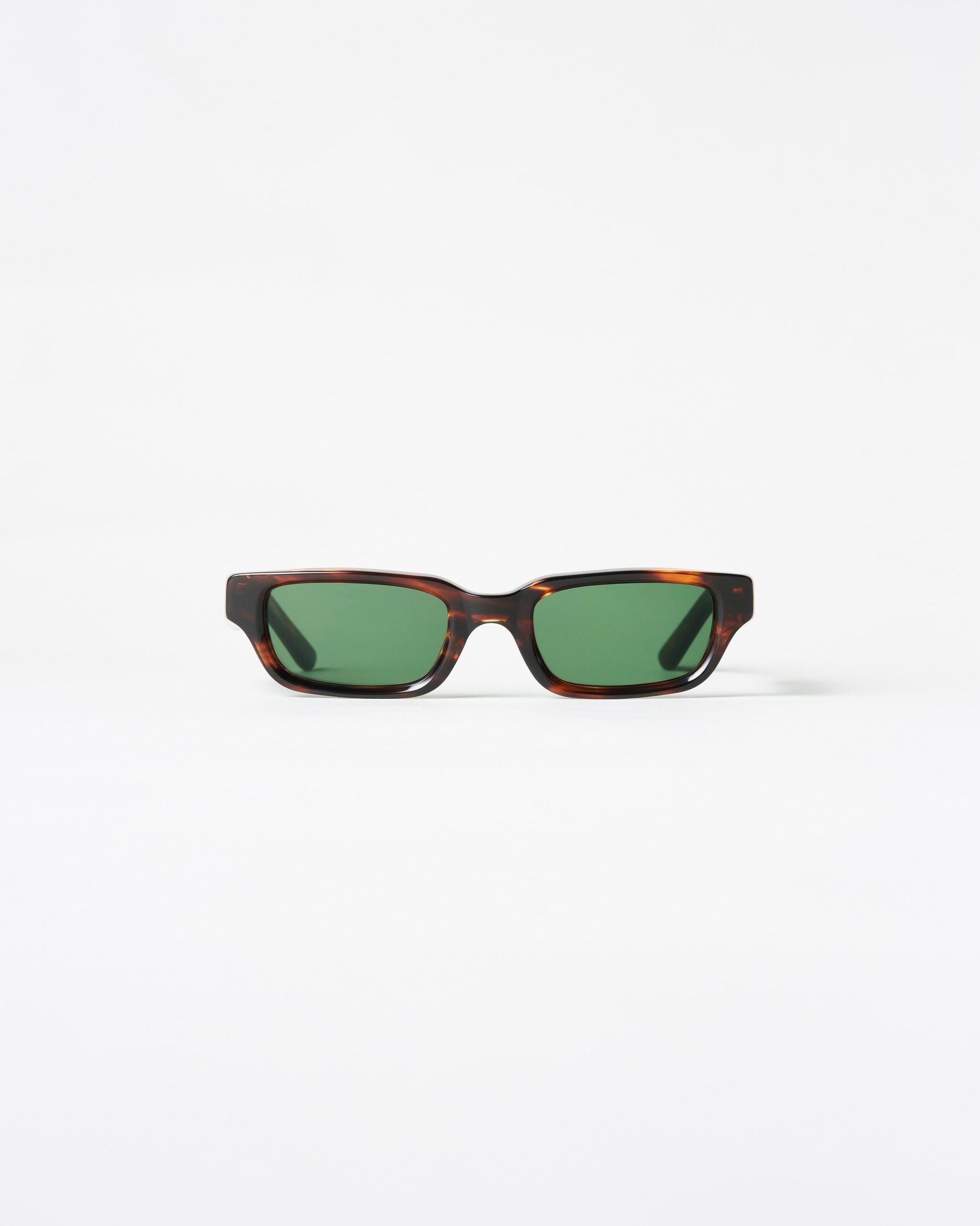 Inspired by the eternal lines and colorscape of the riviera, Sting is a slim rectangular silhouette handcrafted from premium acetate with a dark green lens to protect from the sun.