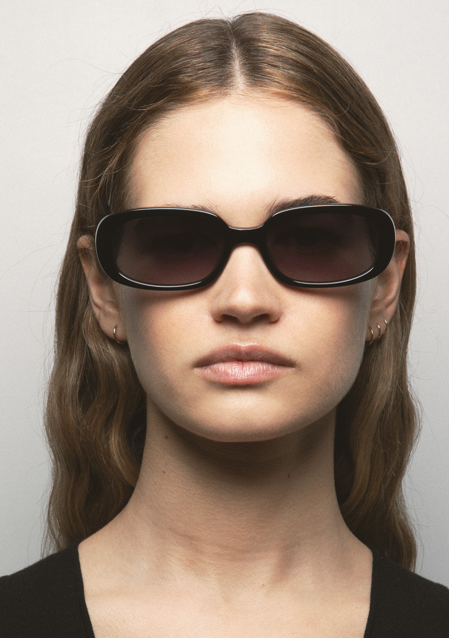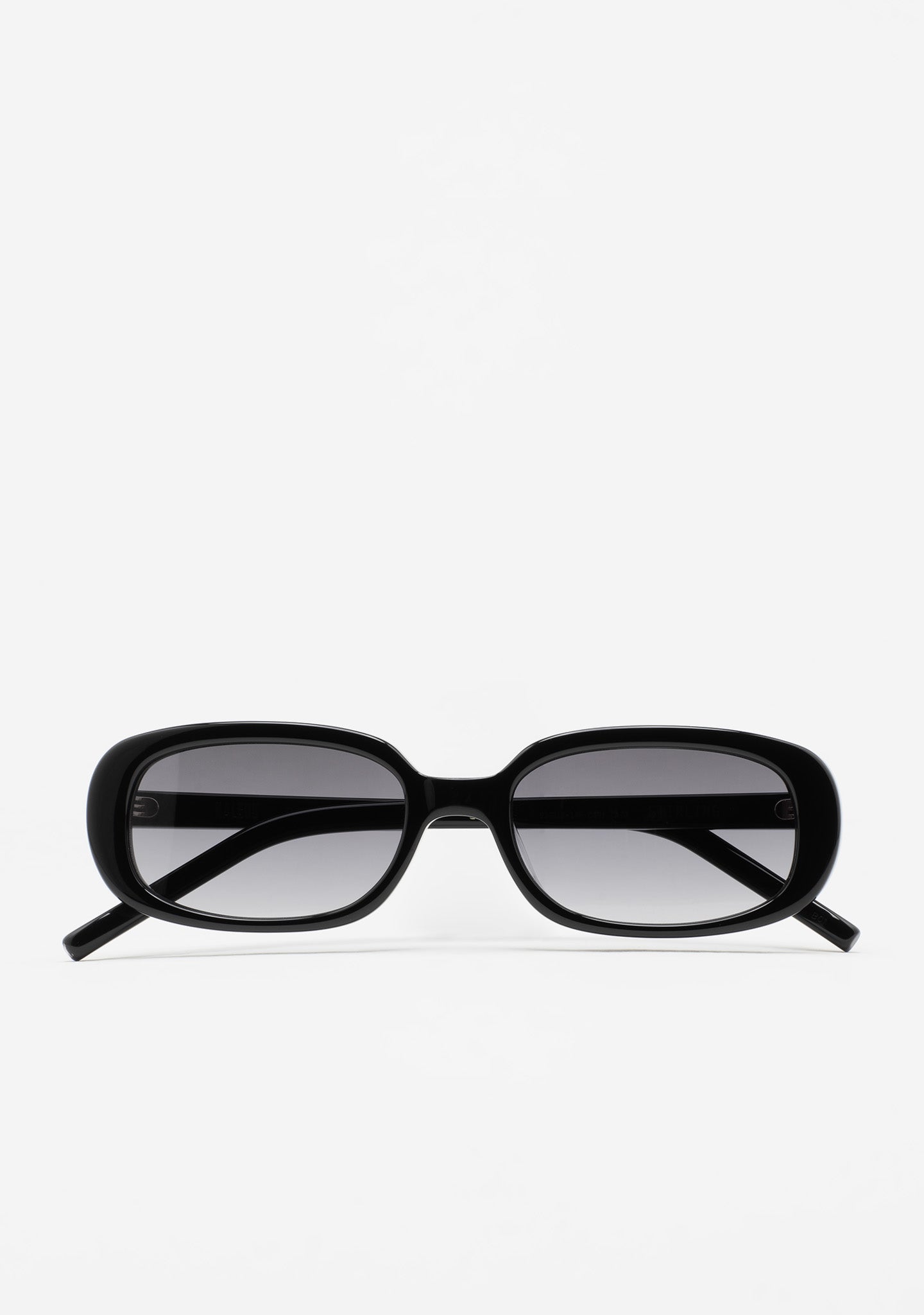 Rectangular-shaped sunglasses. Black acetate front and temples. Black gradient lens, base 2, with 100% UV protection and anti-reflective treatment. Category 3 lens. Integrated acetate nose pads. Handmade.