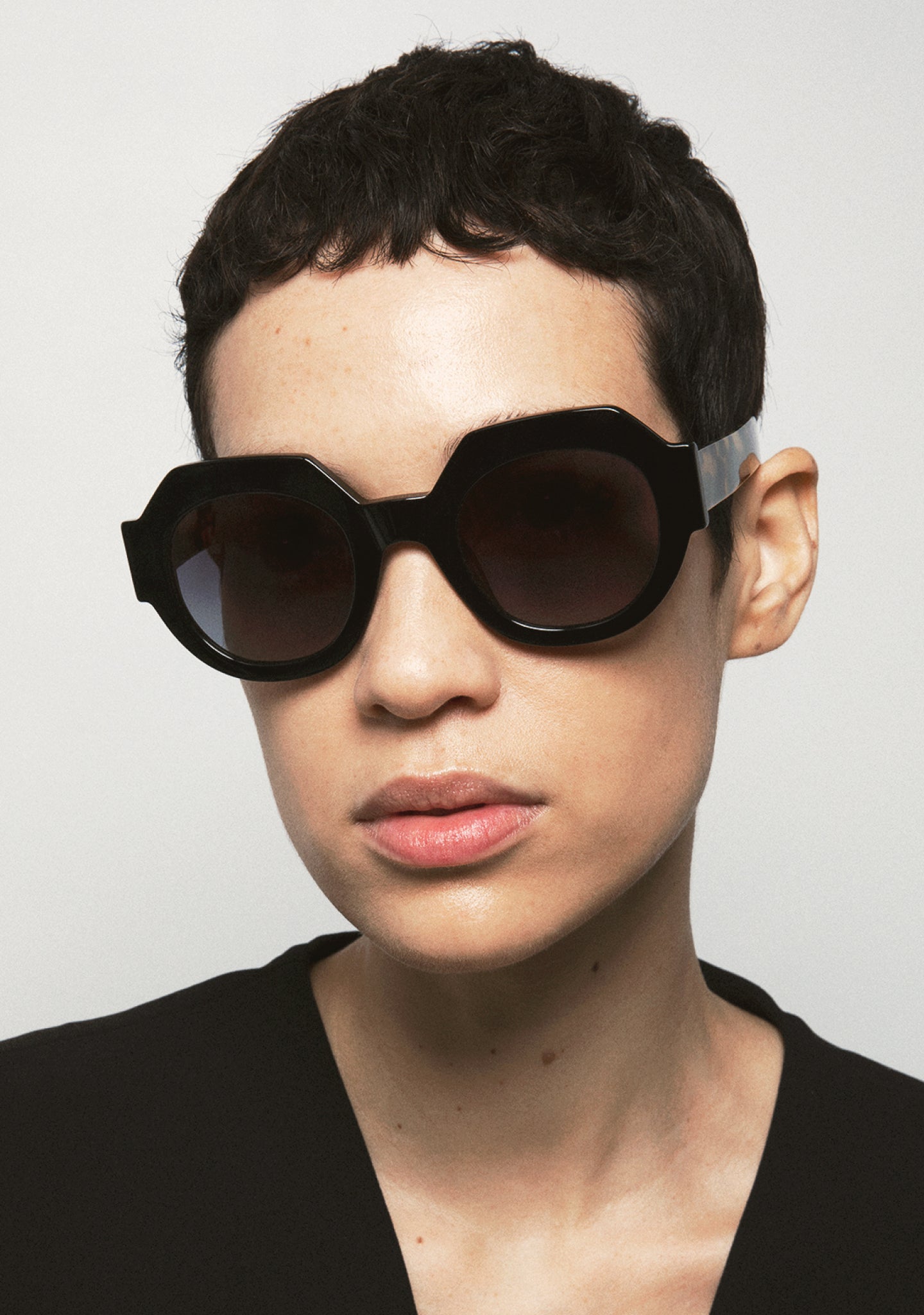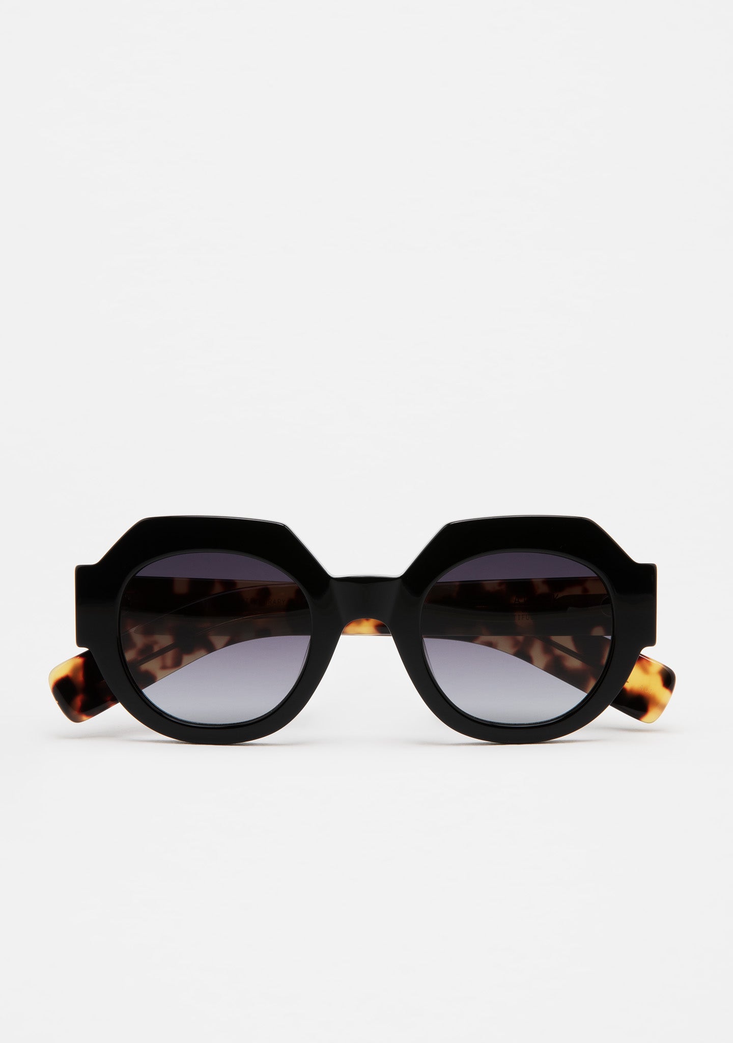 Rounded sunglasses. Acetate frame front in black and acetate temples in brown tortoiseshell. Black gradient tint base 2 lenses with 100% UV protection and anti-reflective treatment. Category 3 lenses. Built-in acetate nose pads. Handmade.