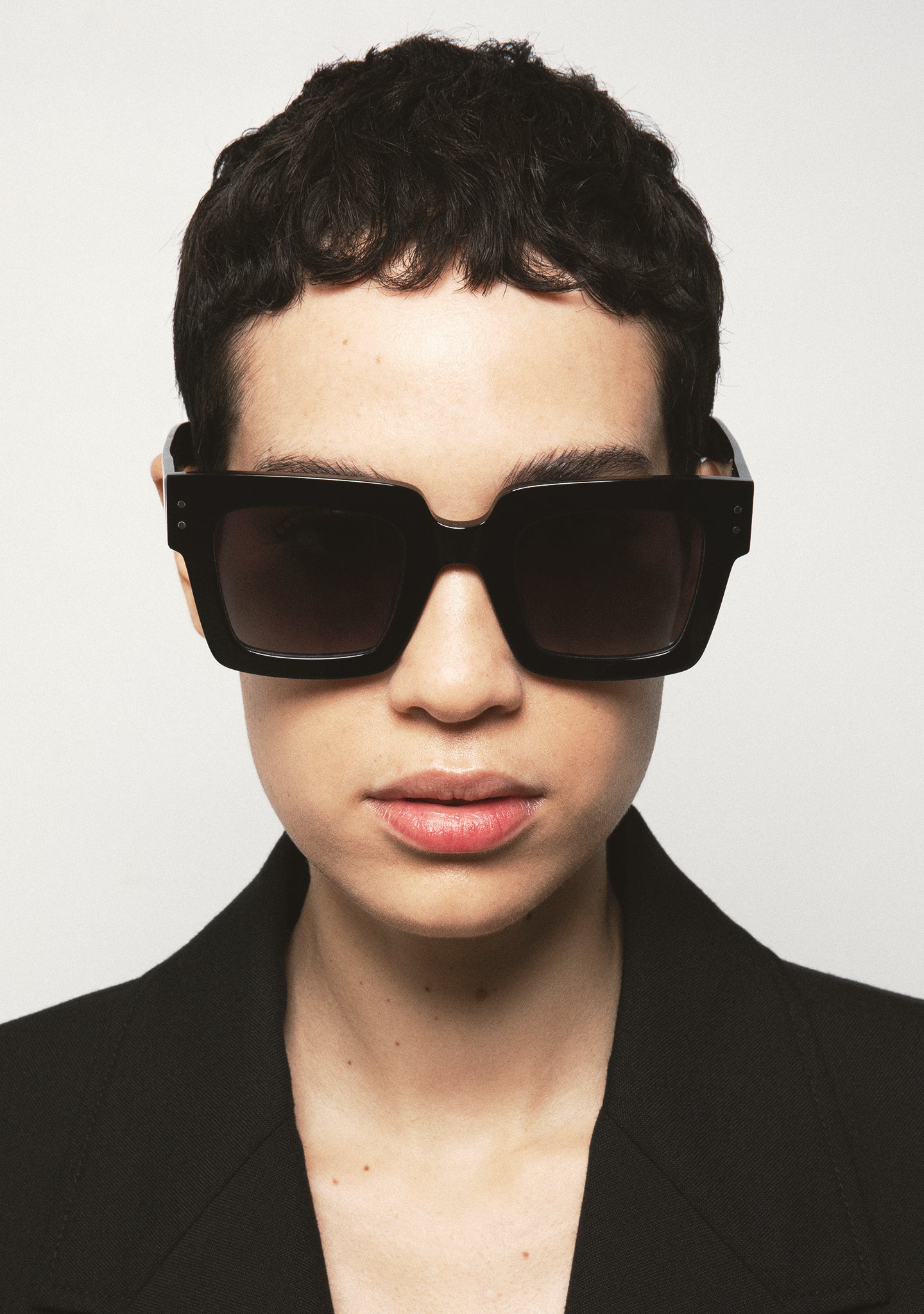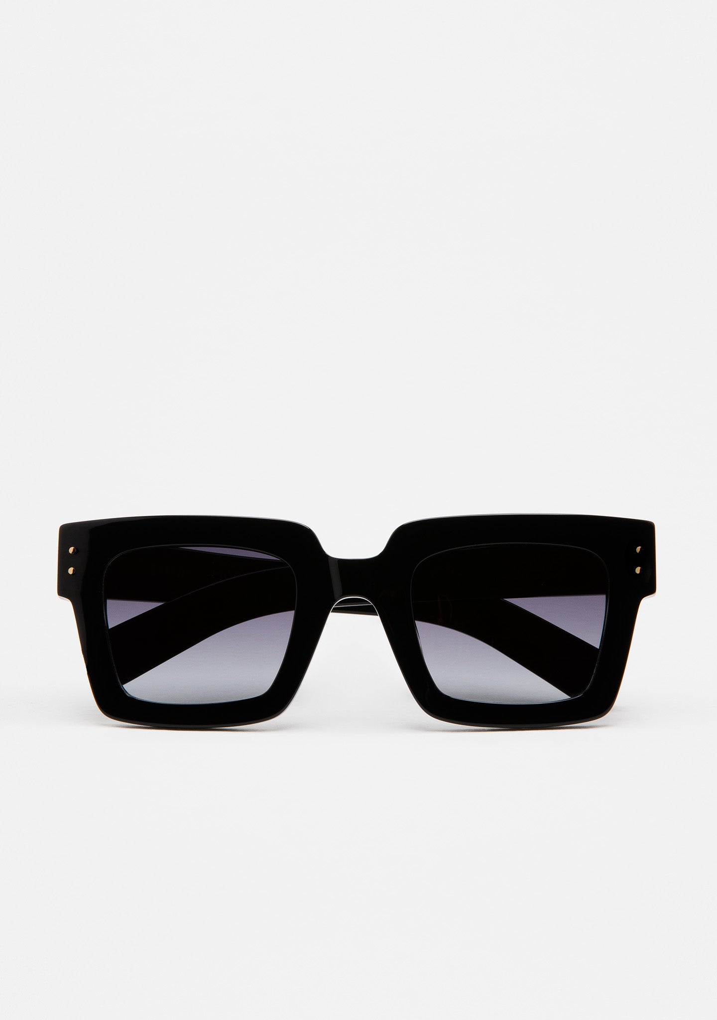 Thin oversized square sunglasses with a straight edge. Black acetate frame front and temples. Hinges with golden rivets on end elbow pieces and temples. Black gradient tint base 2 lenses with 100% UV protection and anti-reflective treatment. Category 3 lenses. Built-in acetate nose pads. Handmade.