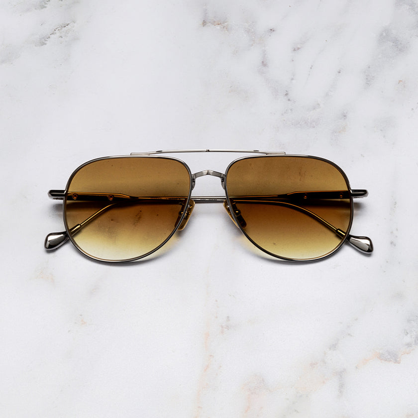 An amplified take on the aviator, created in collaboration with The Great Frog. The classic silhouette is animated with the Lock Down Chain motif, which comes to light on the double nose bridge and temples. Taking six months to create, the frames are handcrafted in Japan from pure titanium.