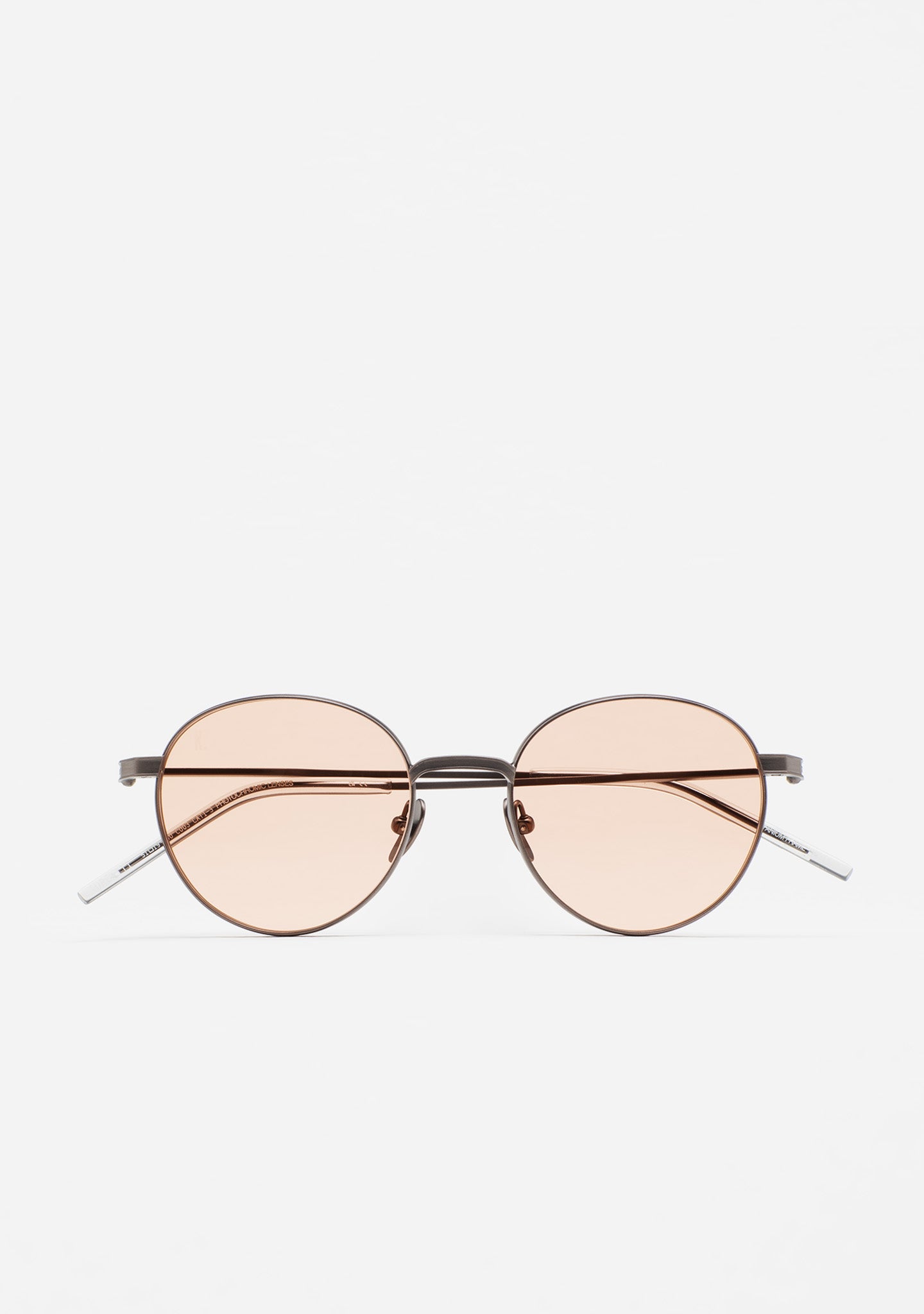 Pantos-shaped sunglasses. Matte dark silver titanium front and temples. Transparent light gray acetate temple tips. Brown photochromic 2-base lens with UV protection and anti-reflective treatment. Category 1-3 lens. Built-in nose pads. Handmade.