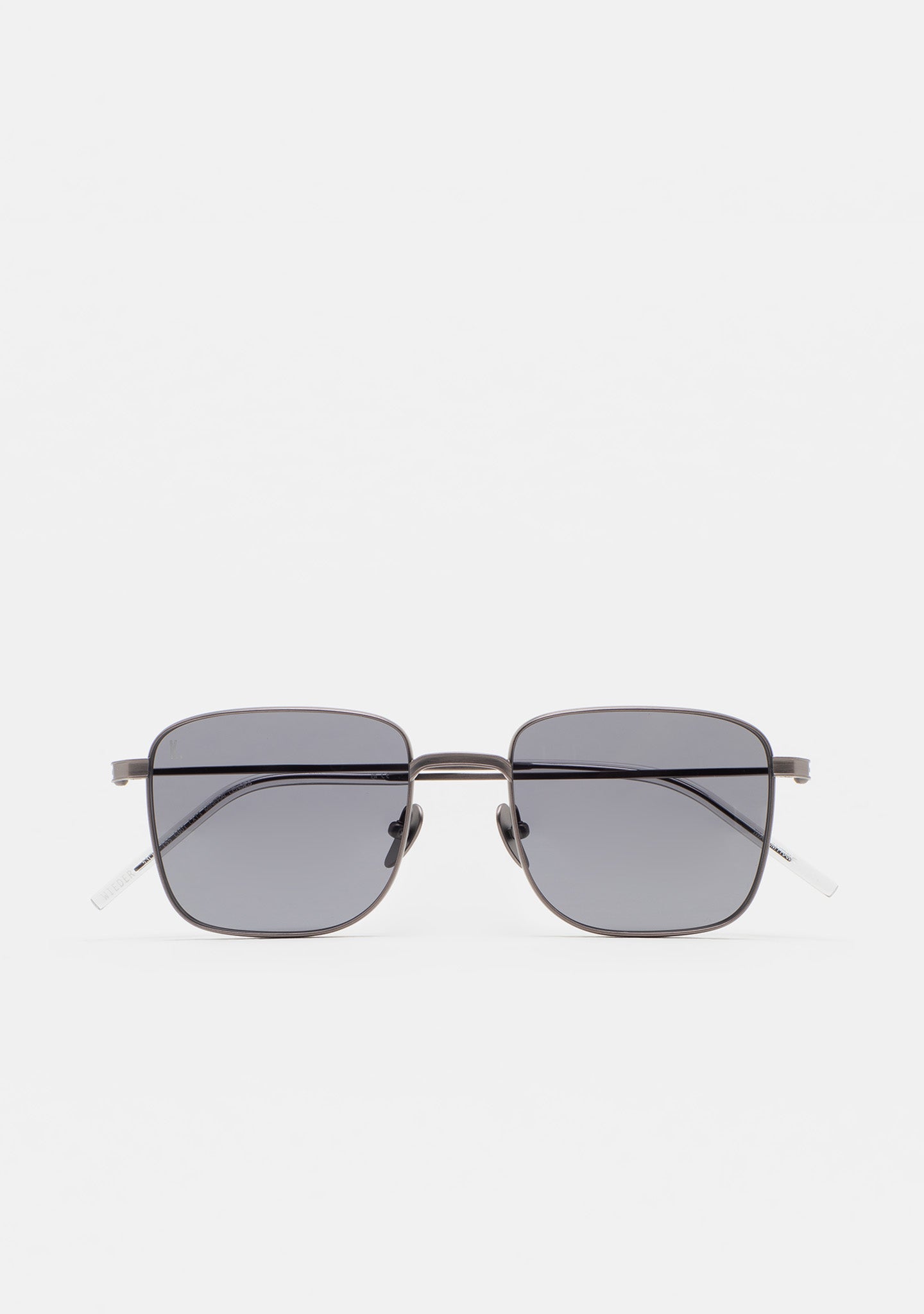 Rectangular sunglasses. Silver titanium front and temples. Temples end in transparent gray acetate tips. Gray mineral lenses, base 2, with 100% UV protection and anti-reflective coating. Category 3 lenses. Integrated nose pads. Handmade.